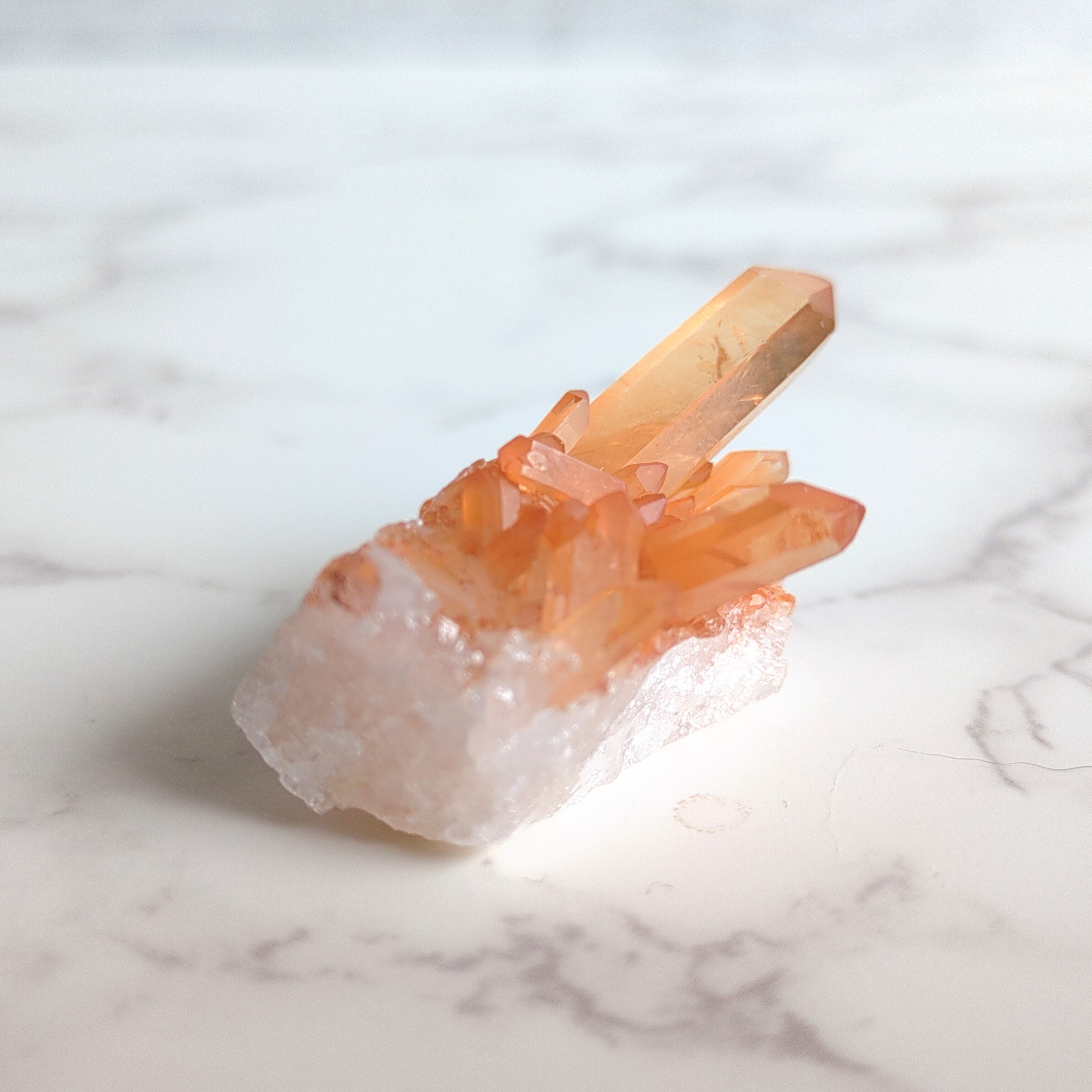 タンジェリンクォーツは、水晶の表面に鉄分(主にヘマタイト)が付着することで、やさしいオレンジ色を帯びた個性的な石です。