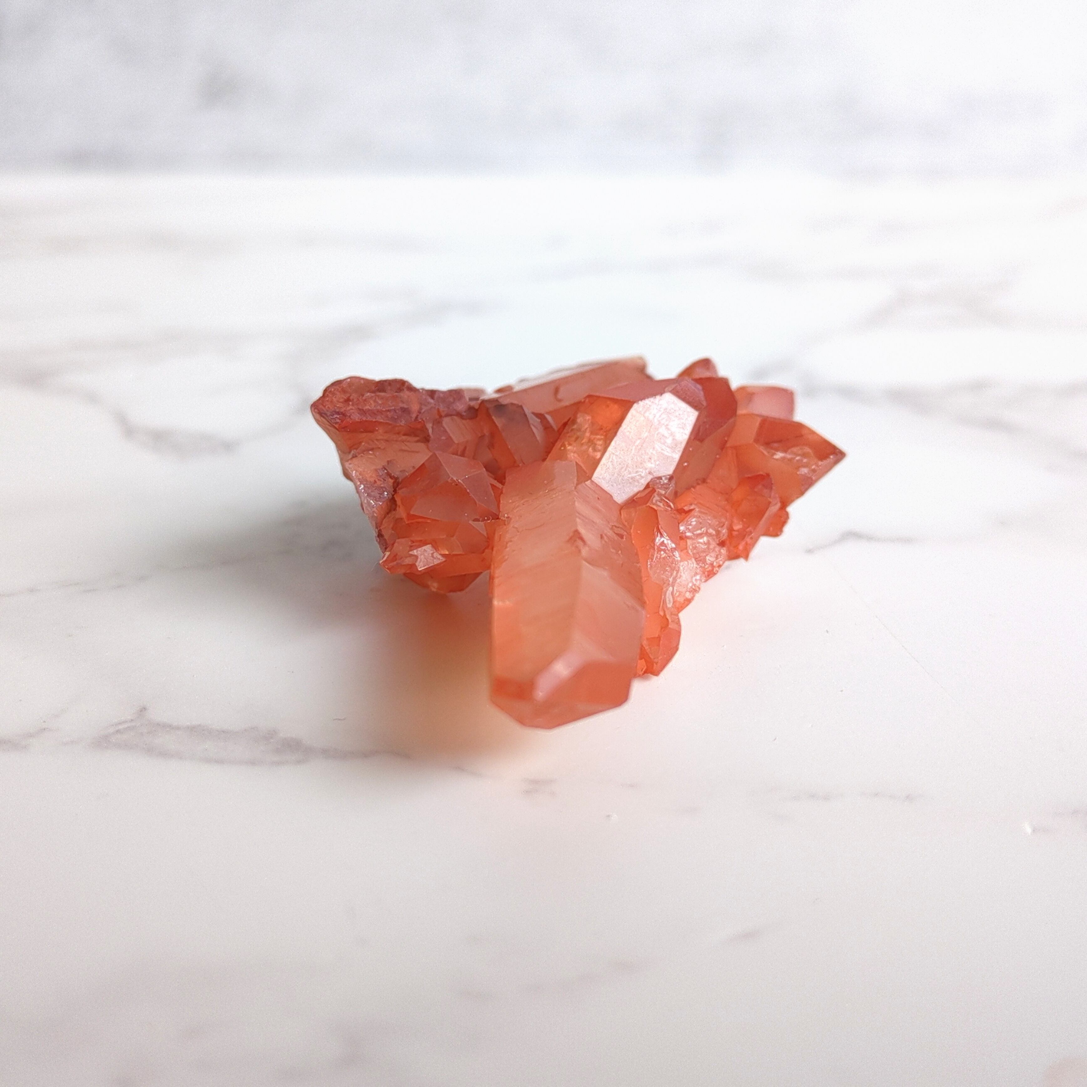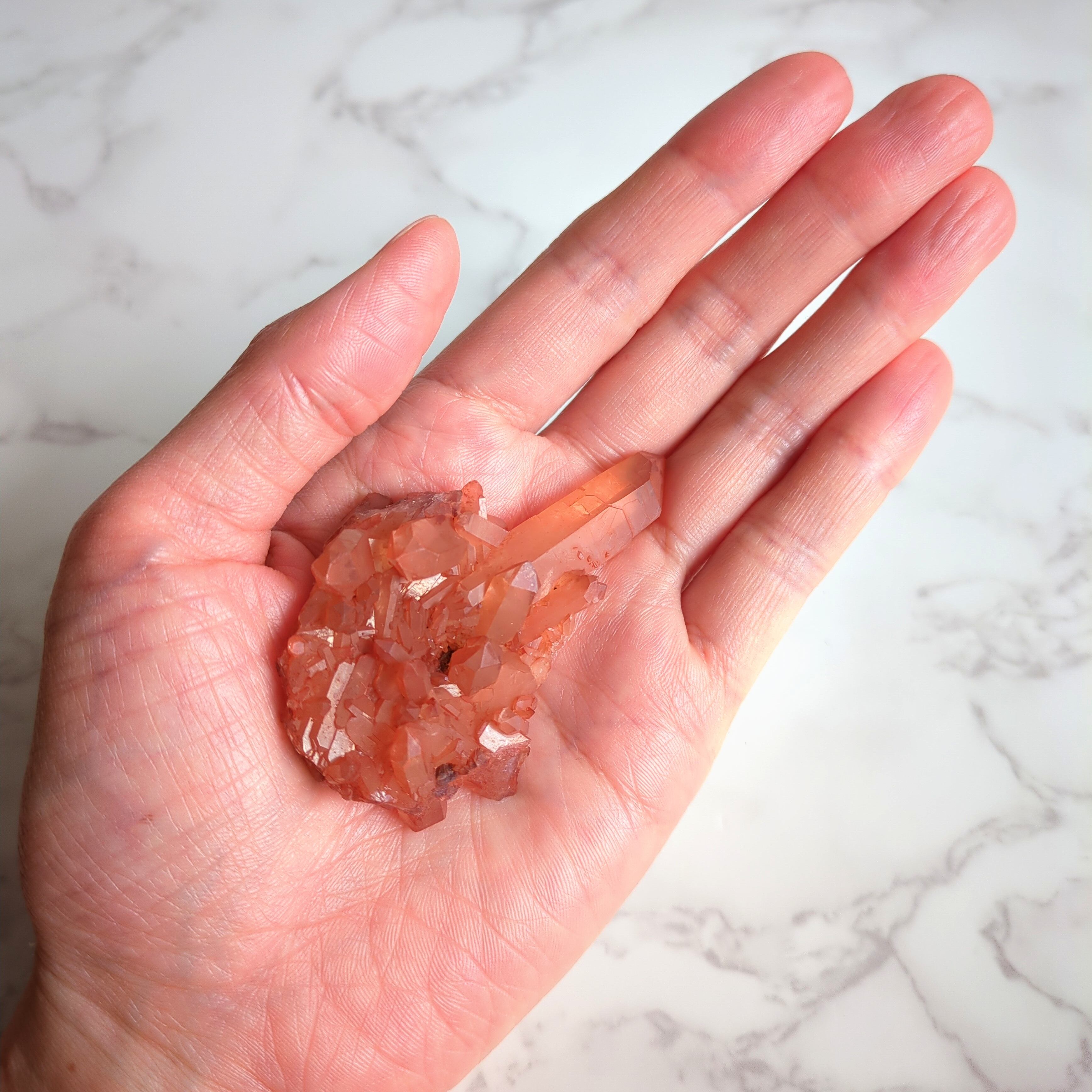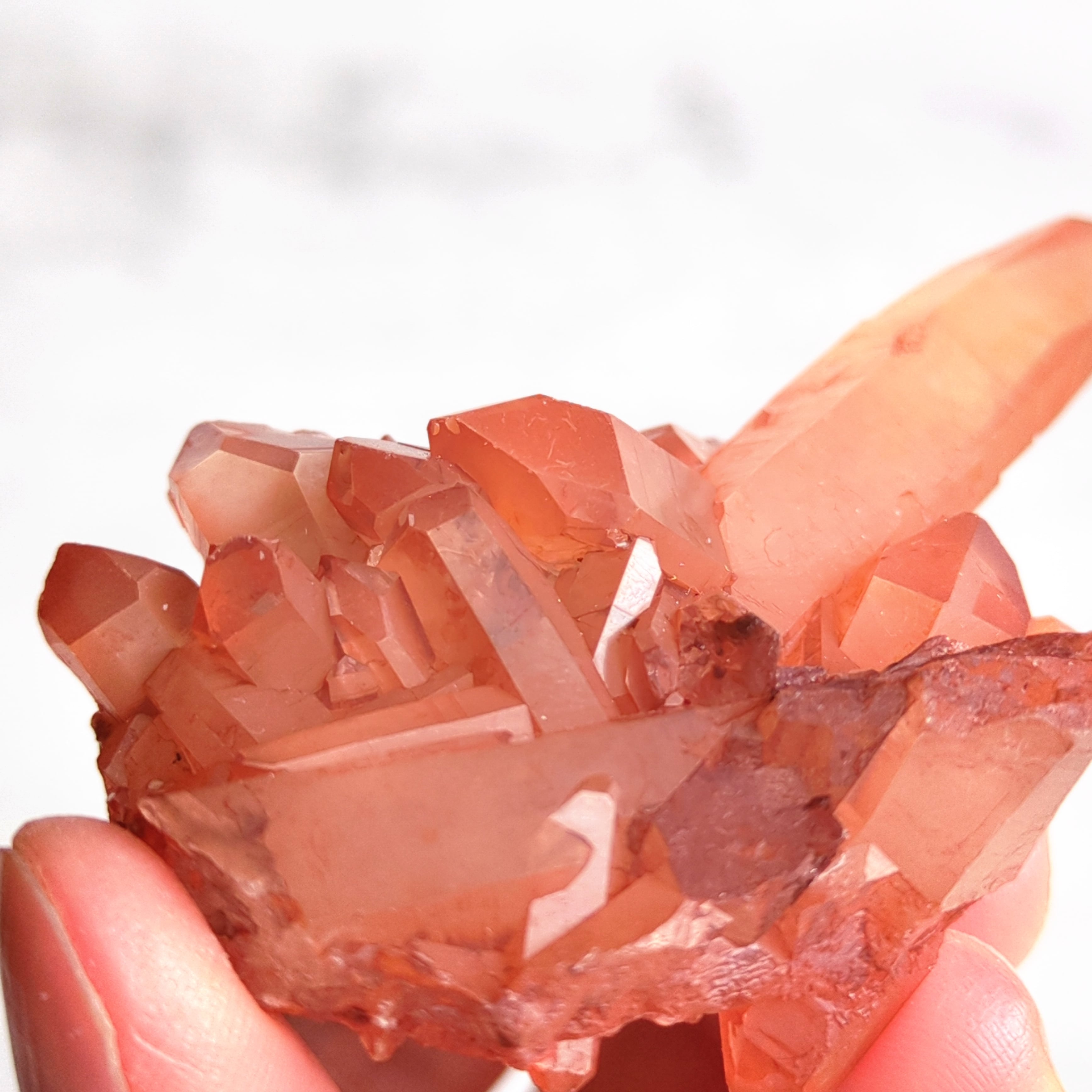 タンジェリンクォーツは、水晶の表面に鉄分(主にヘマタイト)が付着することで、やさしいオレンジ色を帯びた個性的な石です。