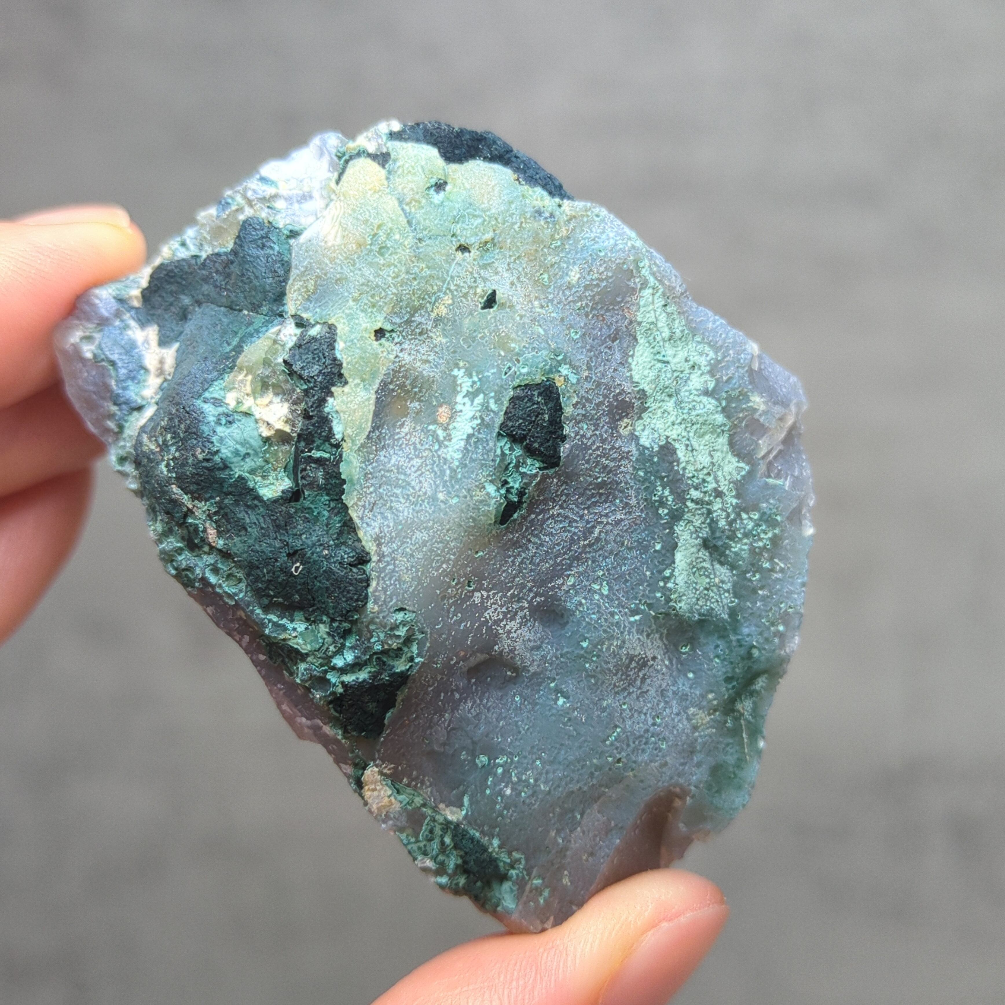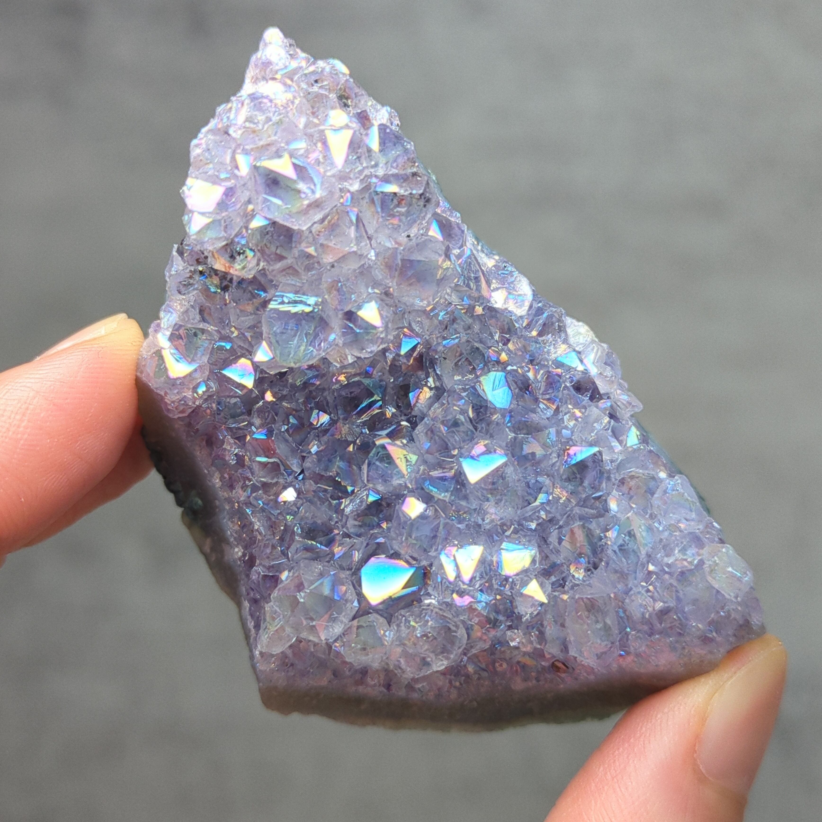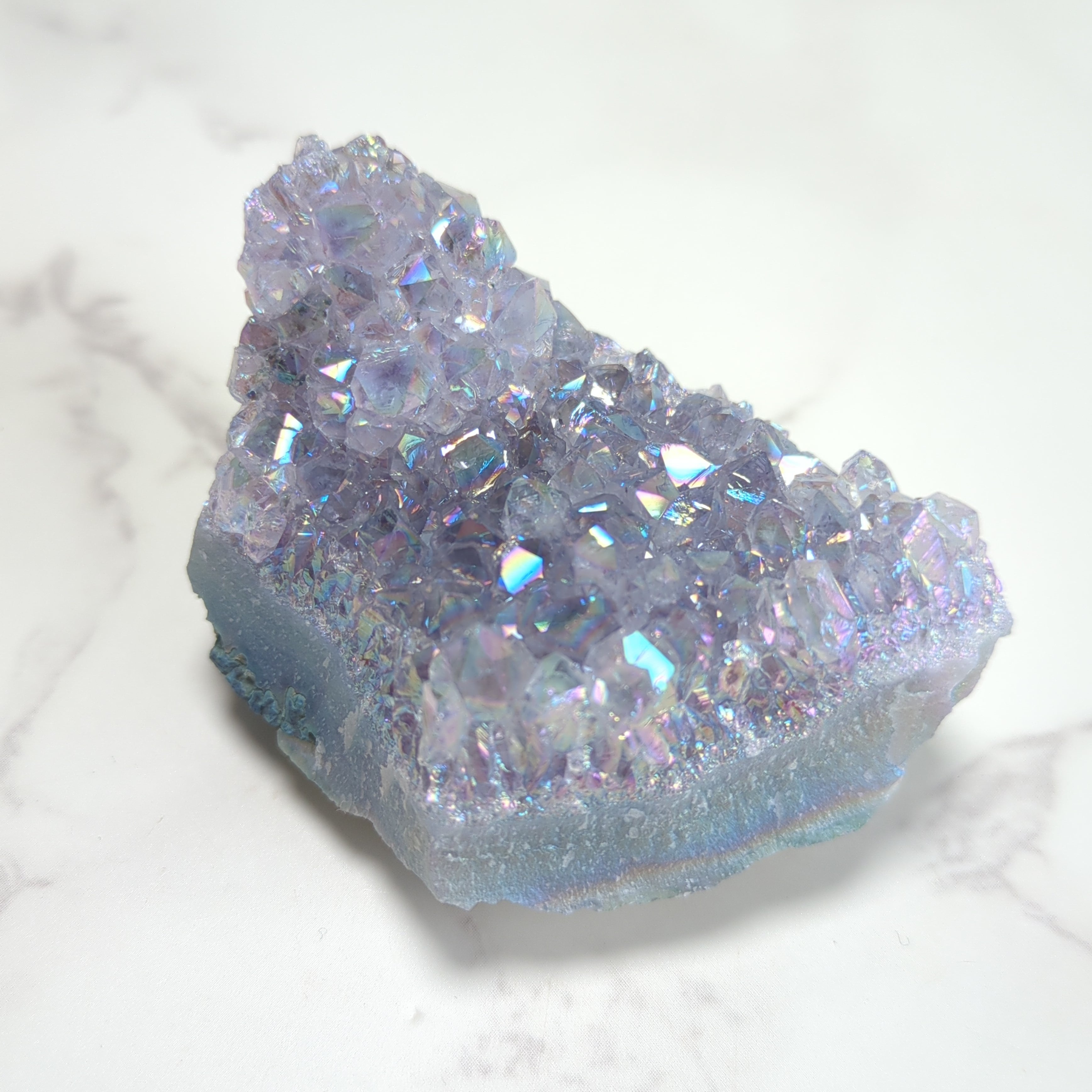結晶の粒が七色にきらめき、美しさの中にどこか愛らしさも感じるピースです。