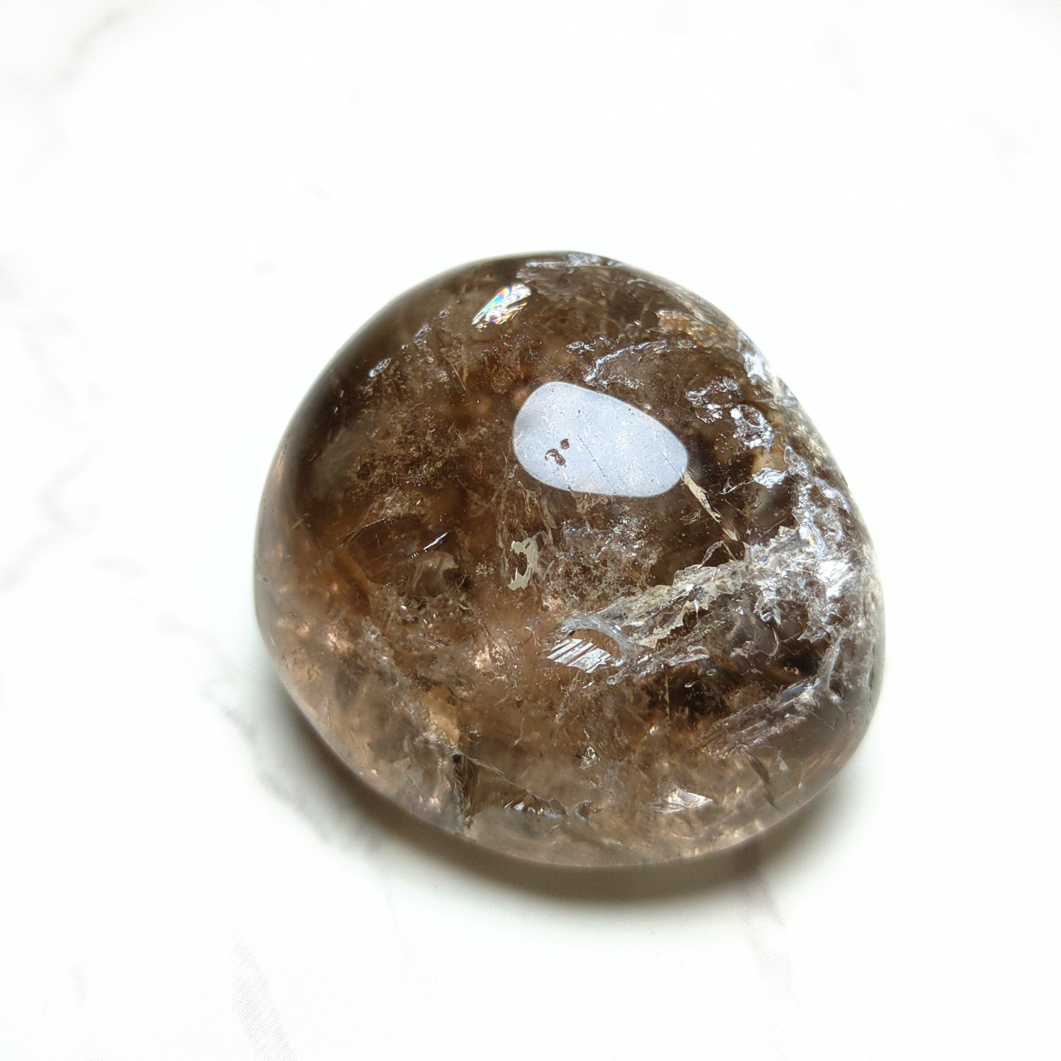 スモーキーなカラーの中に、エレスチャル特有の層や細かな空洞が光を反射して眩く輝き、虹もみられシックながらも力強く美しいピース。
