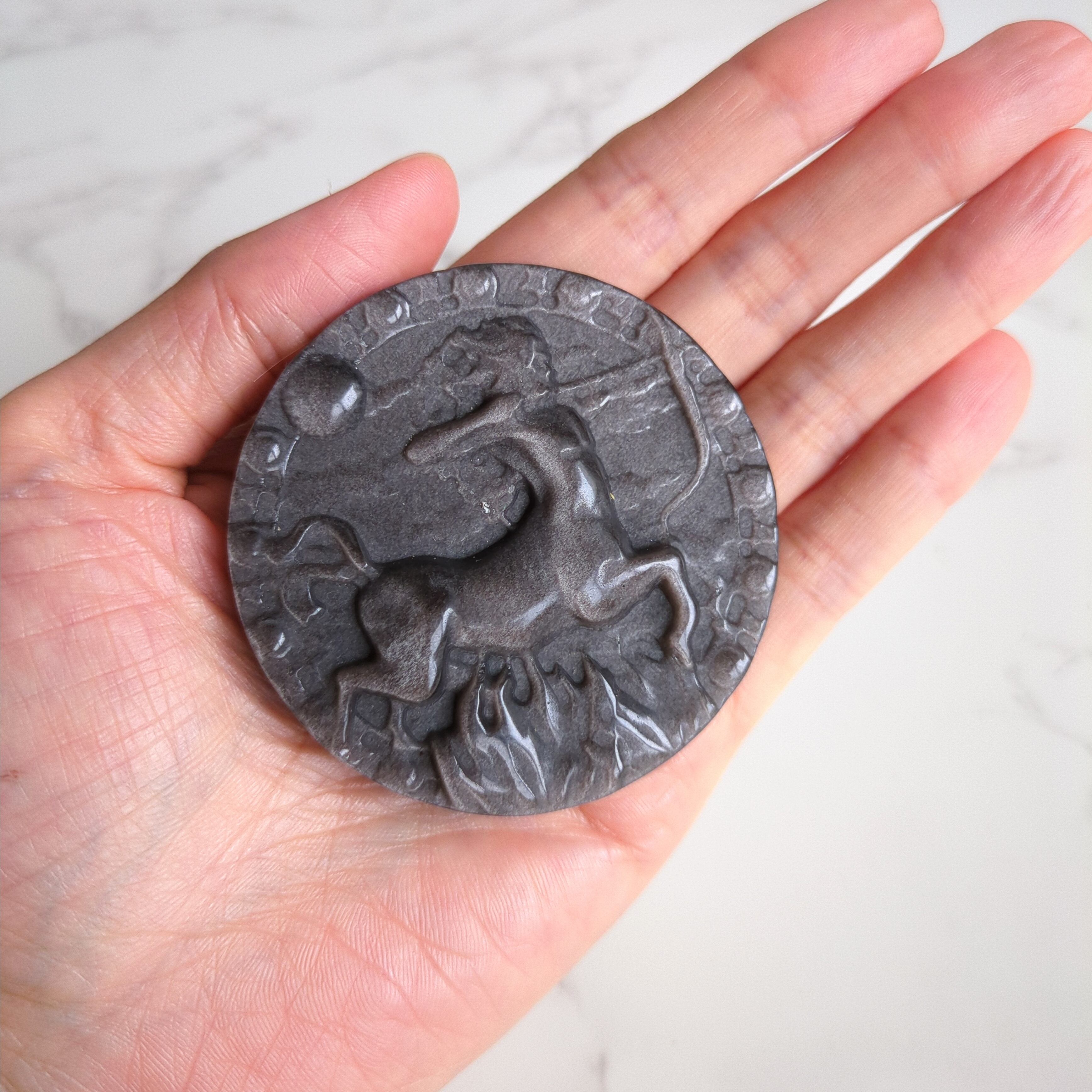 シックな光沢が美しい、シルバーオブシディアンの射手座プレートです。
