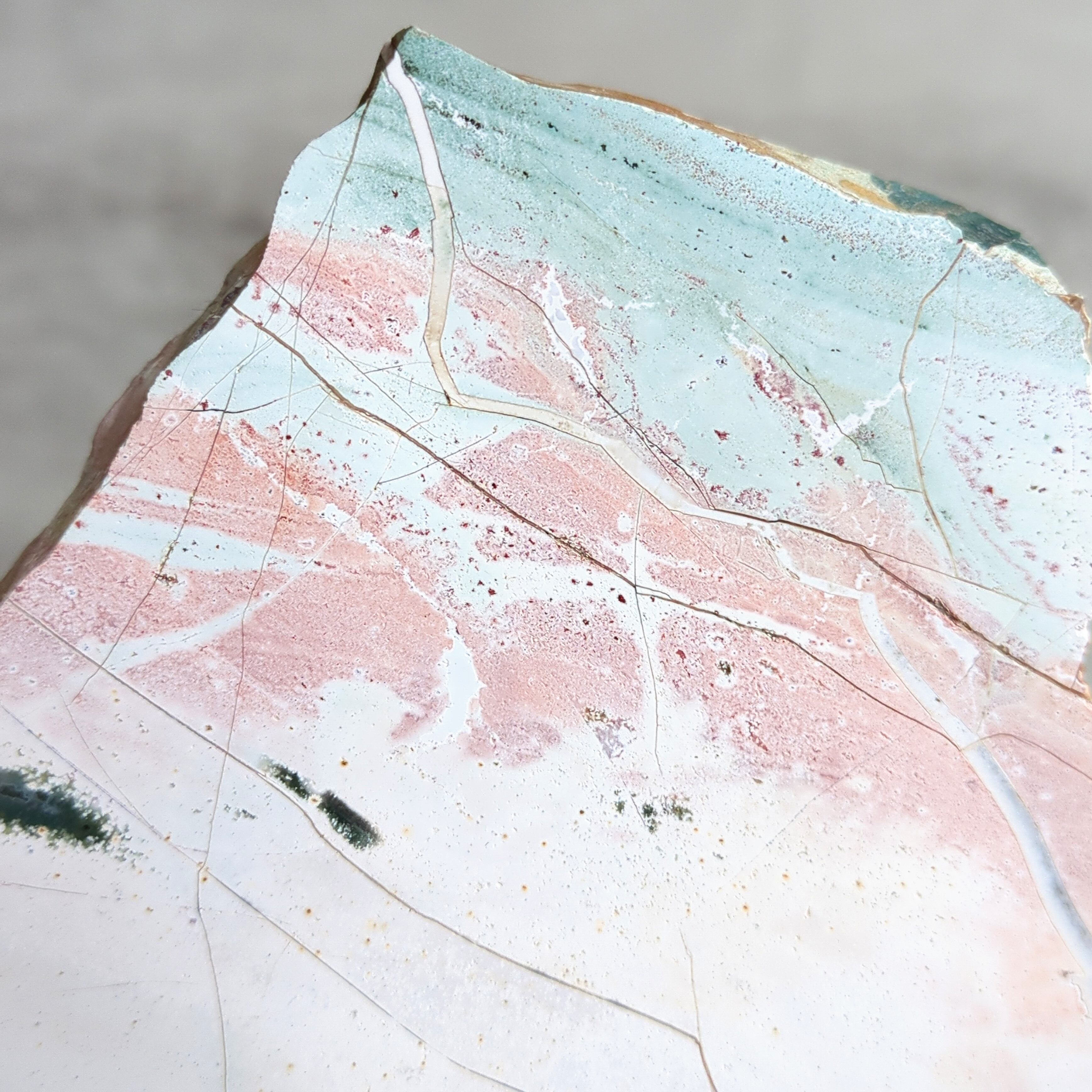 やわらかなピンクと淡いグリーン・ホワイトがやさしく、ところどころ絵本の世界のような模様が広がるアートのようなピース。