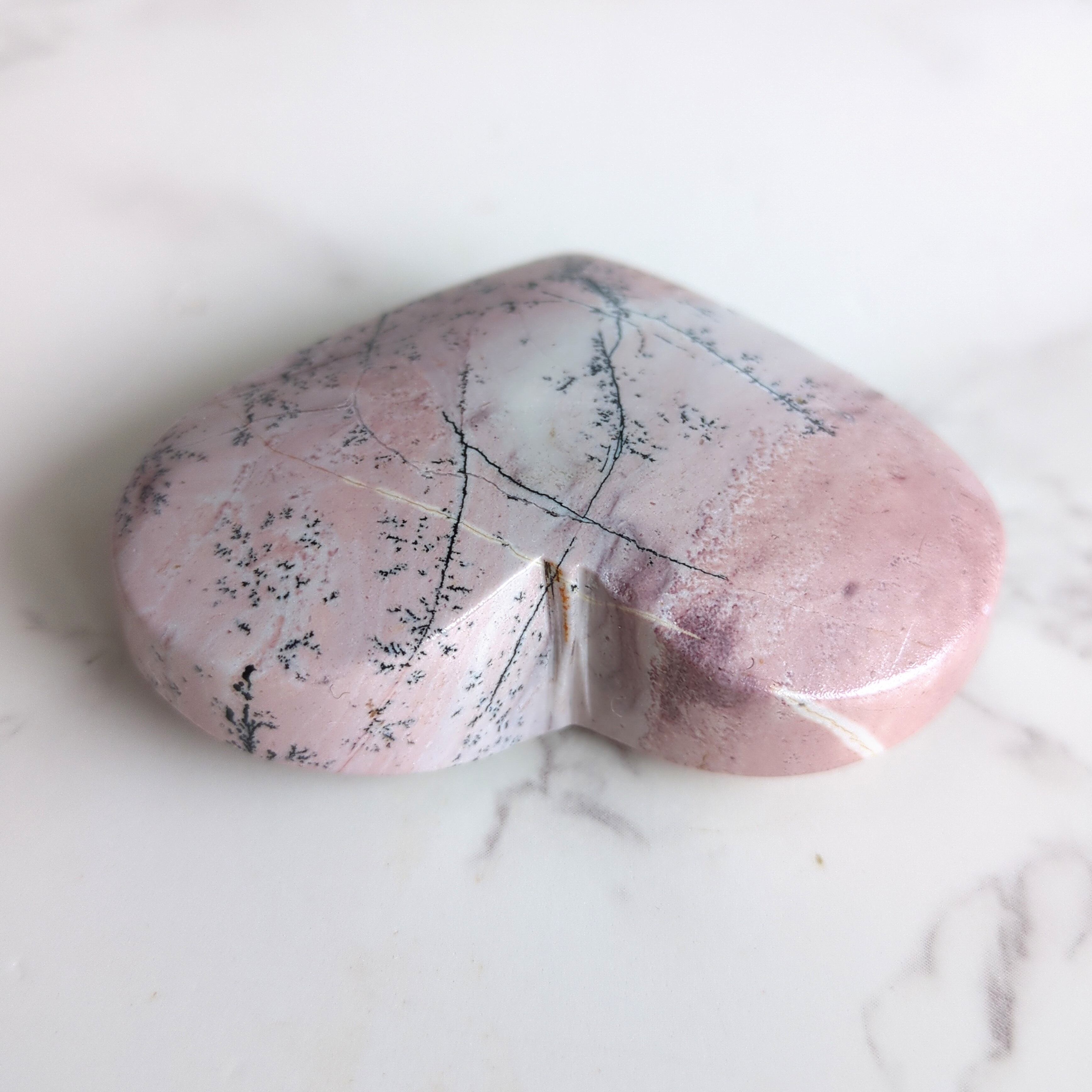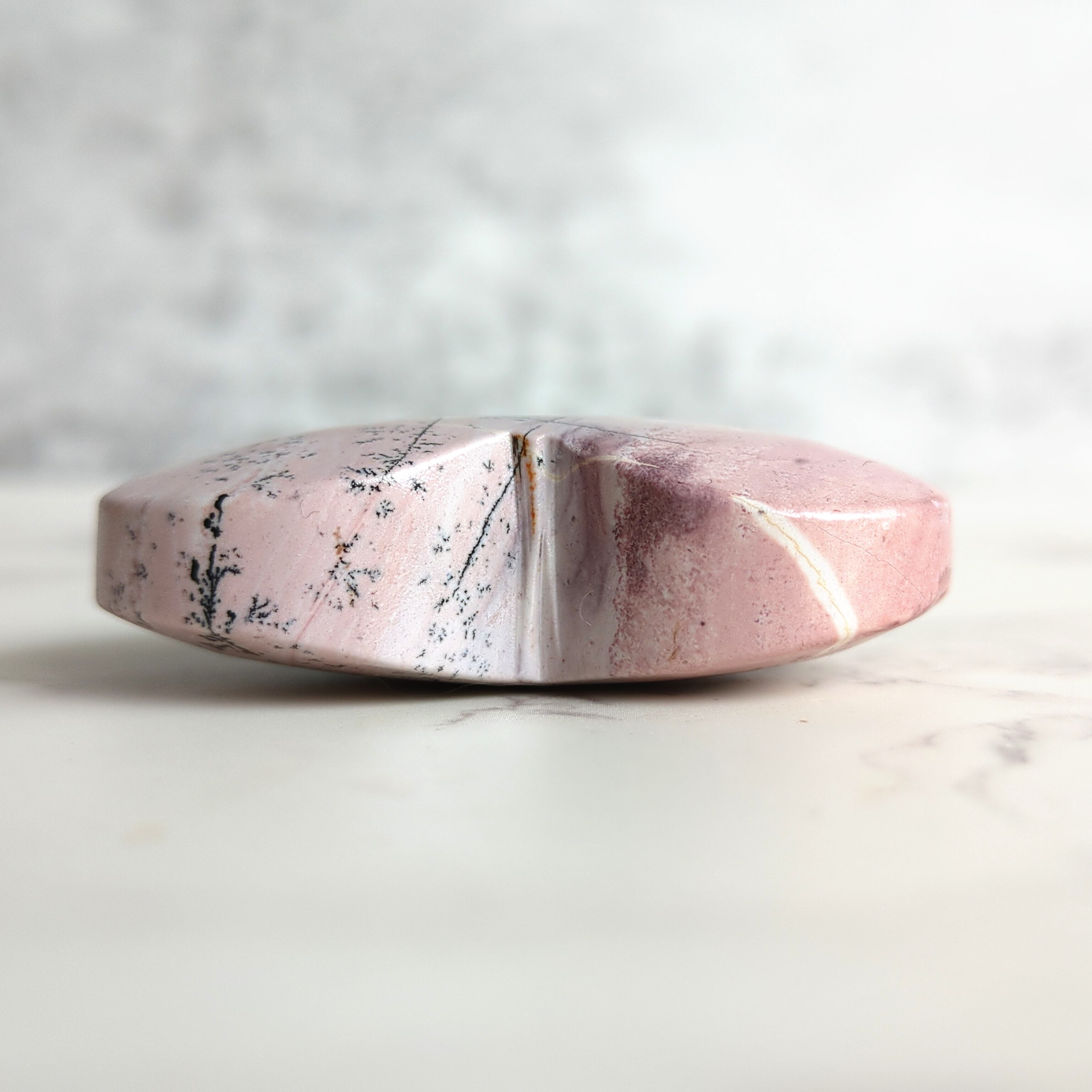 落ち着いたピンクのマーブルの中に木の枝の模様のような柄が繊細に混ざり合った、アート作品のような上品なピースです。