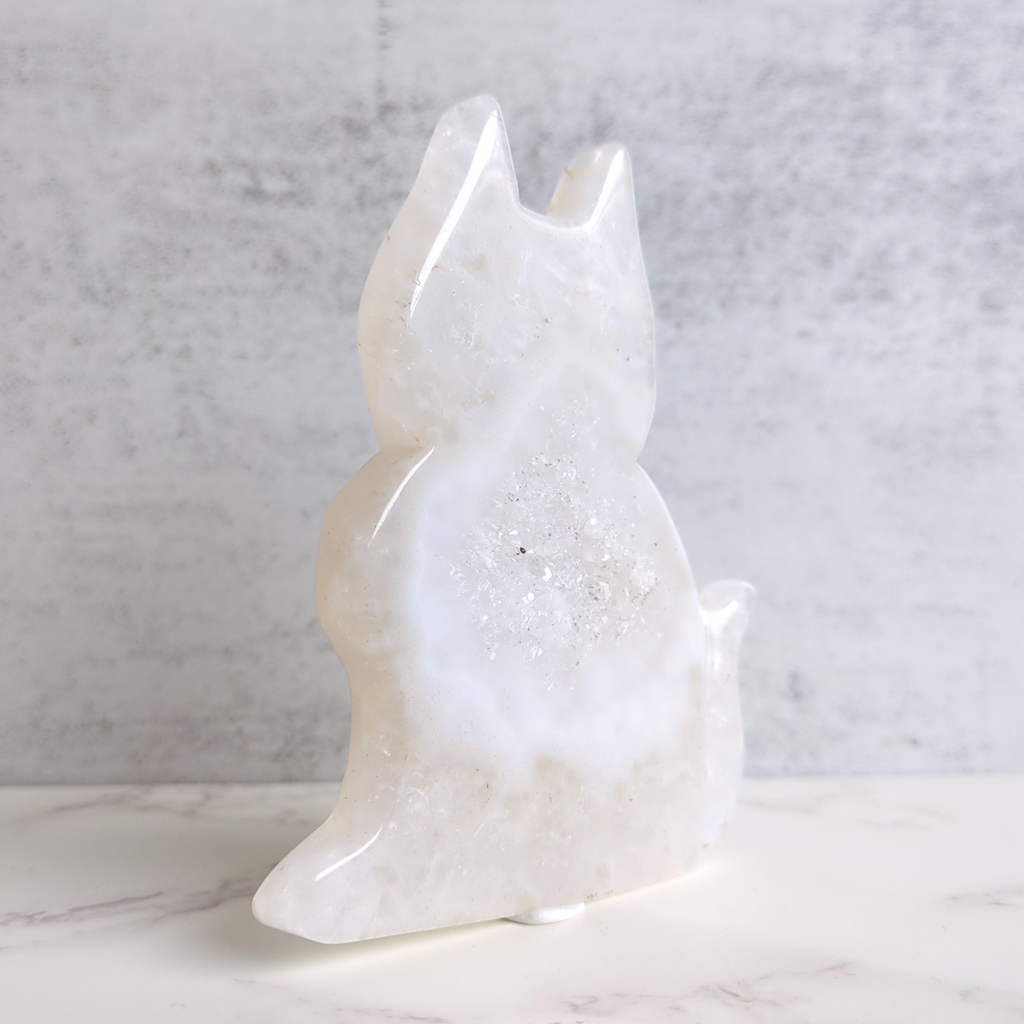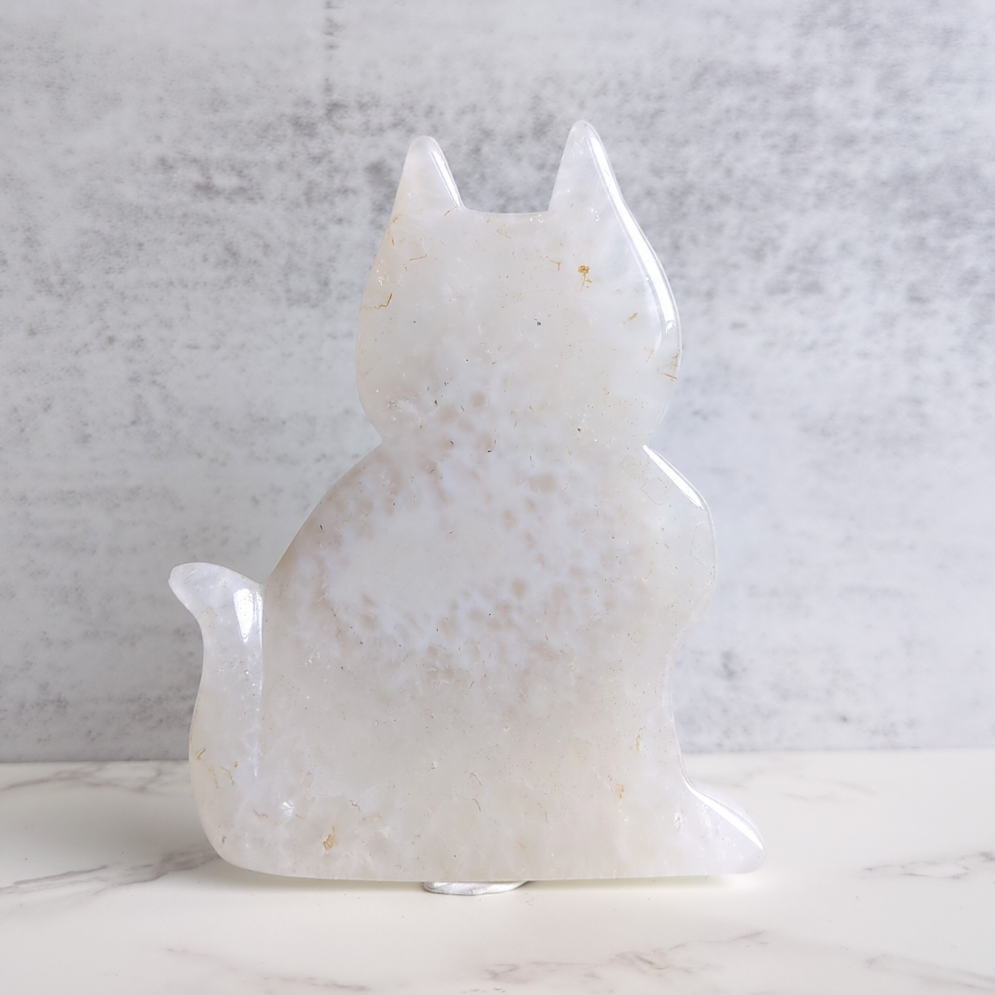 透け感のあるザクザクのボディの中央にホワイトのアゲートが入り、さらに胸元はドゥルージーが煌めく愛らしい猫さんです。