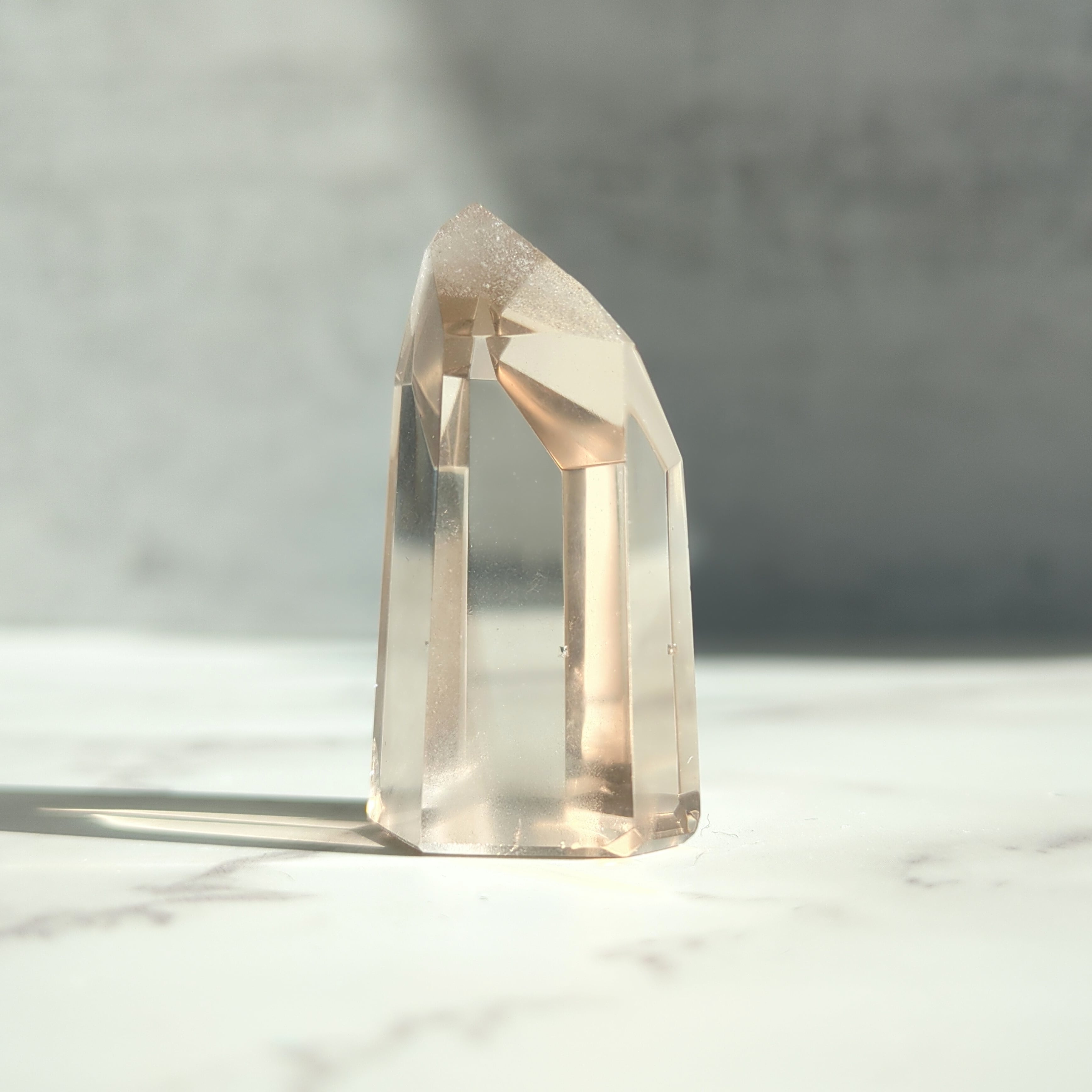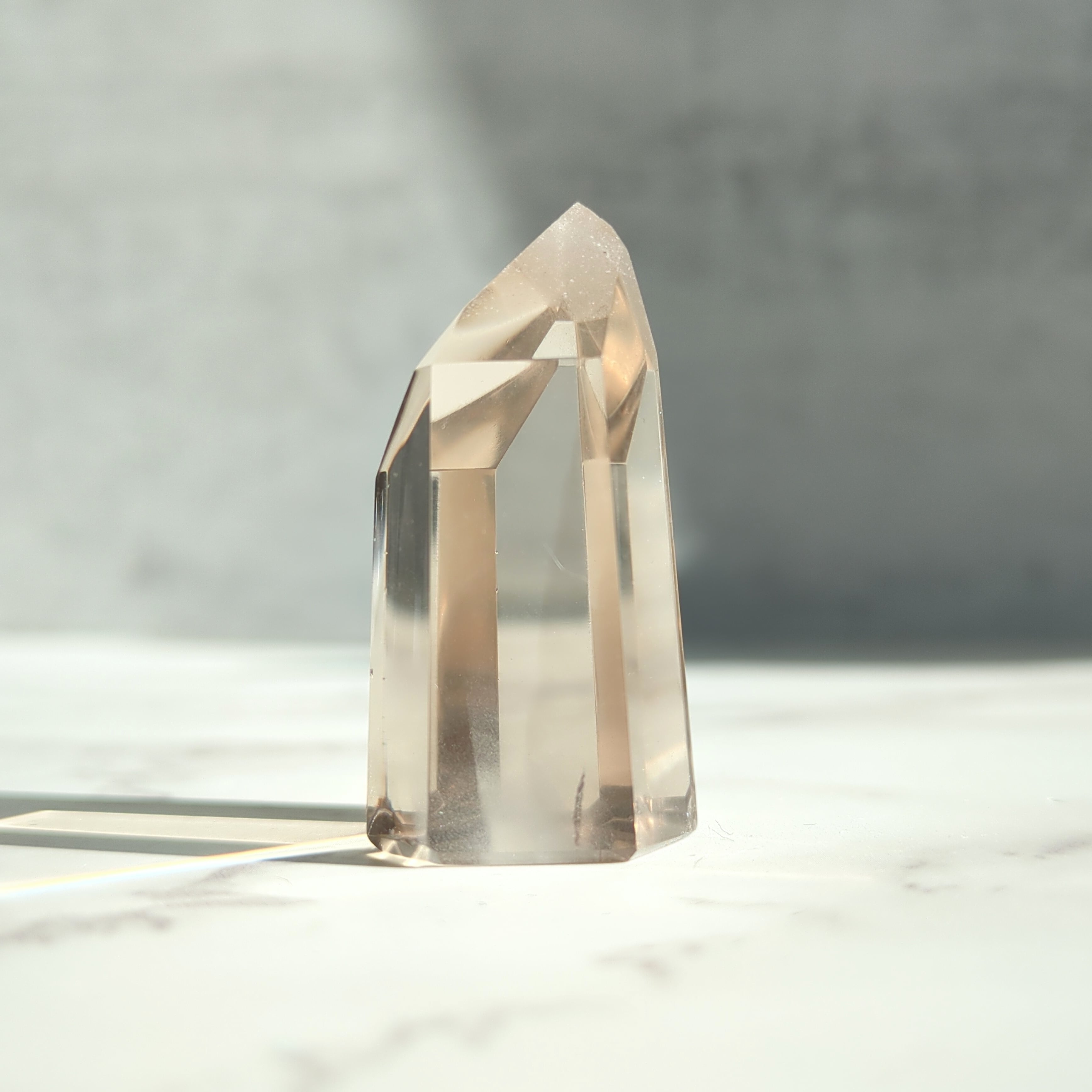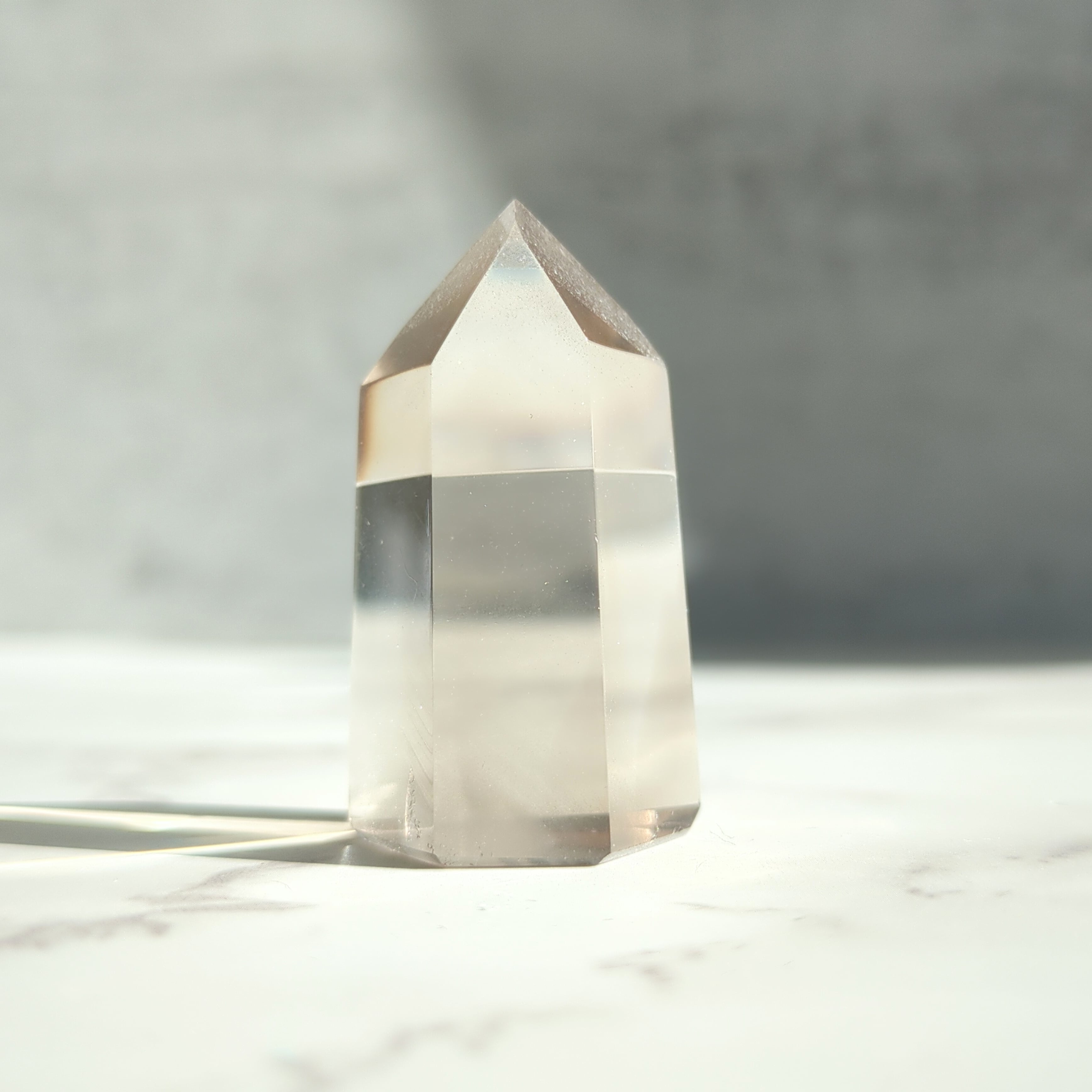 透明度の高いスモーキークォーツの内部に、繊細な層が静かに浮かび上がる幻想的なピース。