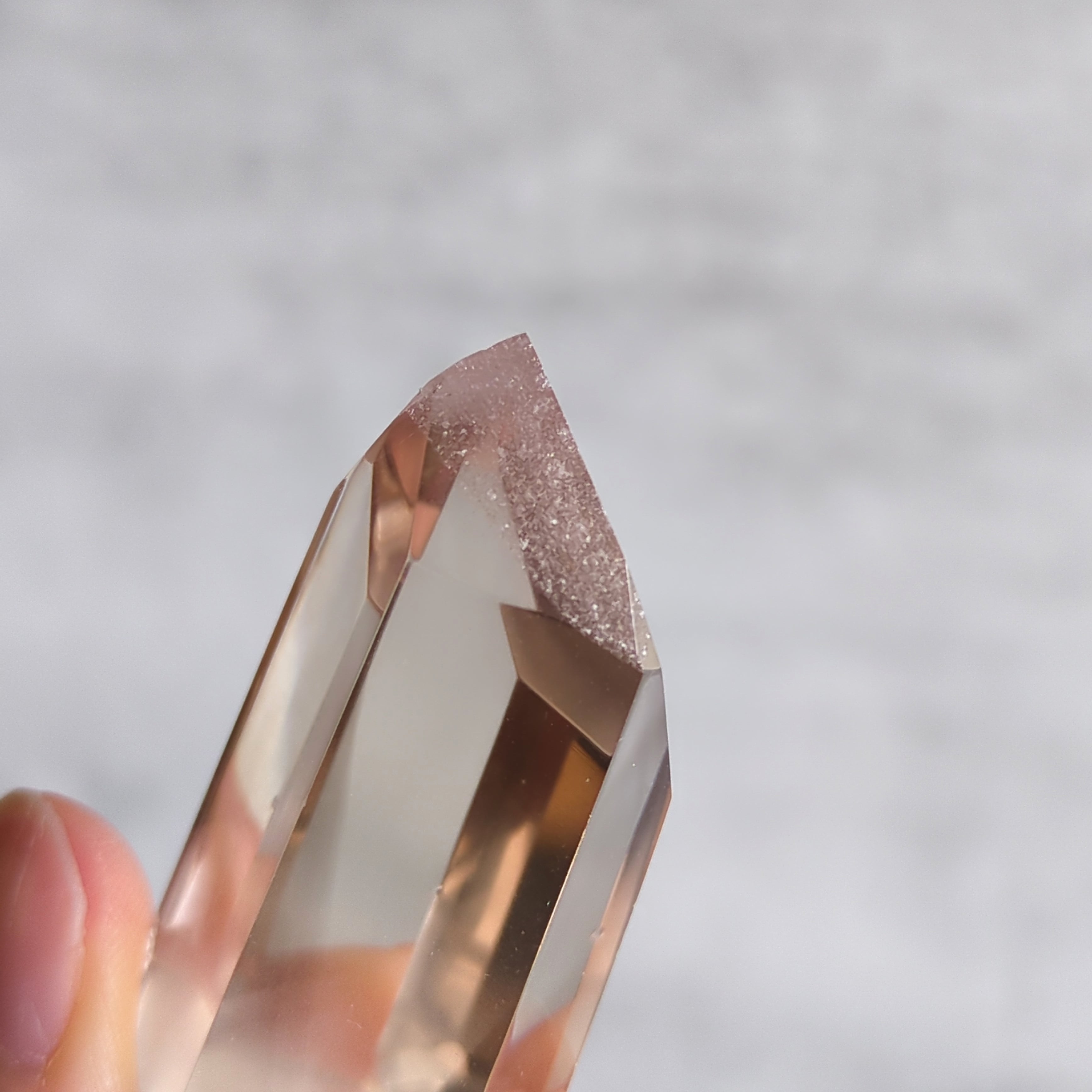 その美しさは、結晶内部に現れる影のような層が光の角度によって変化し、まるで奥深くに隠された物語のような印象を与えます。