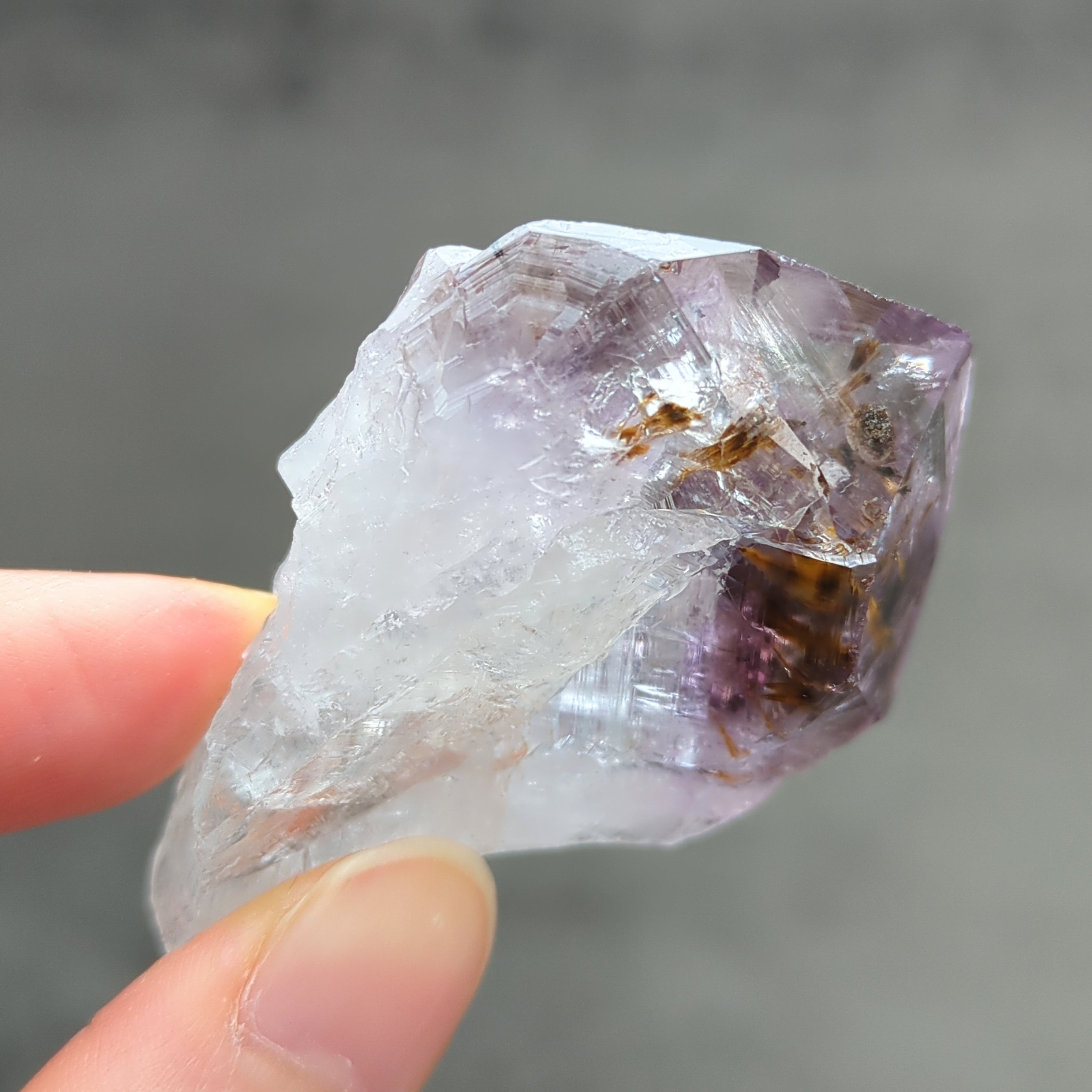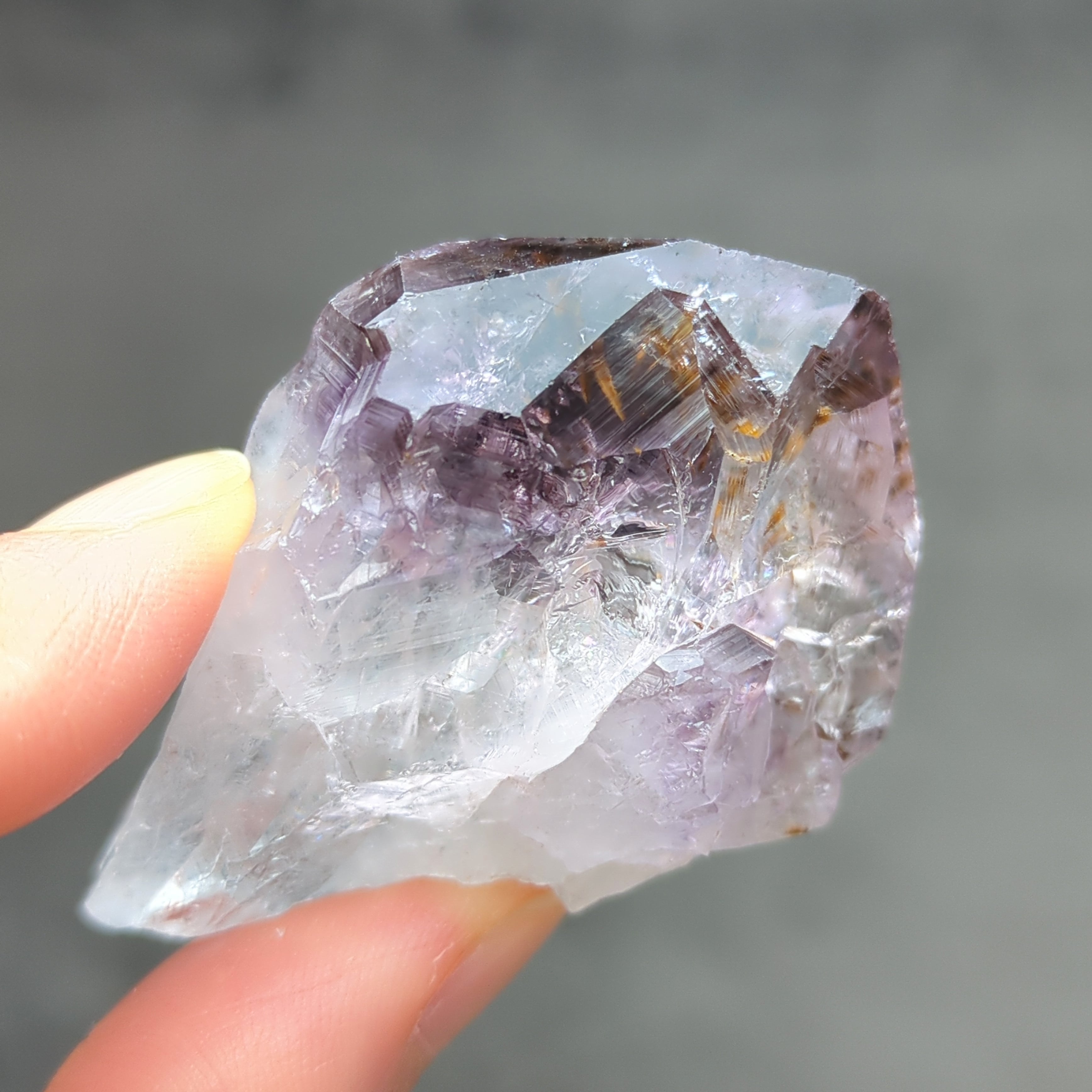 アメシストの結晶内部にゲーサイト(針鉄鉱)が針状に入り込んだ鉱物です。