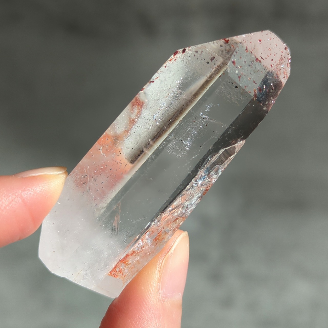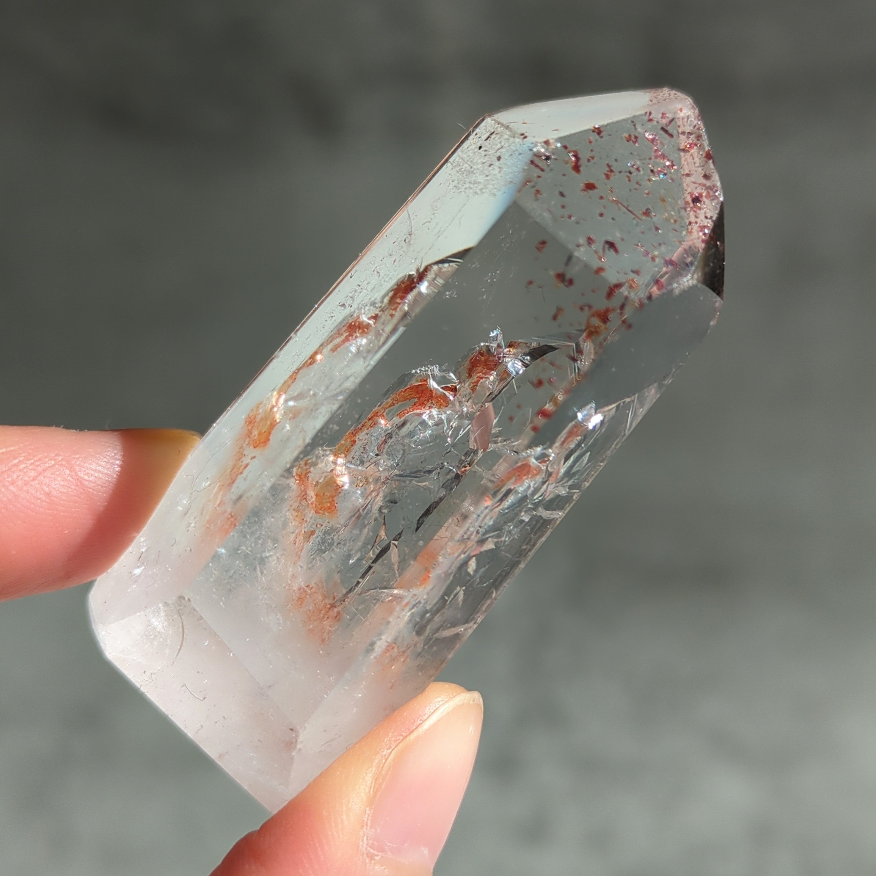 クォーツの二酸化ケイ素に酸化鉄が加わることで、赤色や赤褐色、時に銀灰色の表情が現れます。インクルージョンの入り方によって、雲状、鱗片状、膜状など多様な景色を見せるのが特徴です。