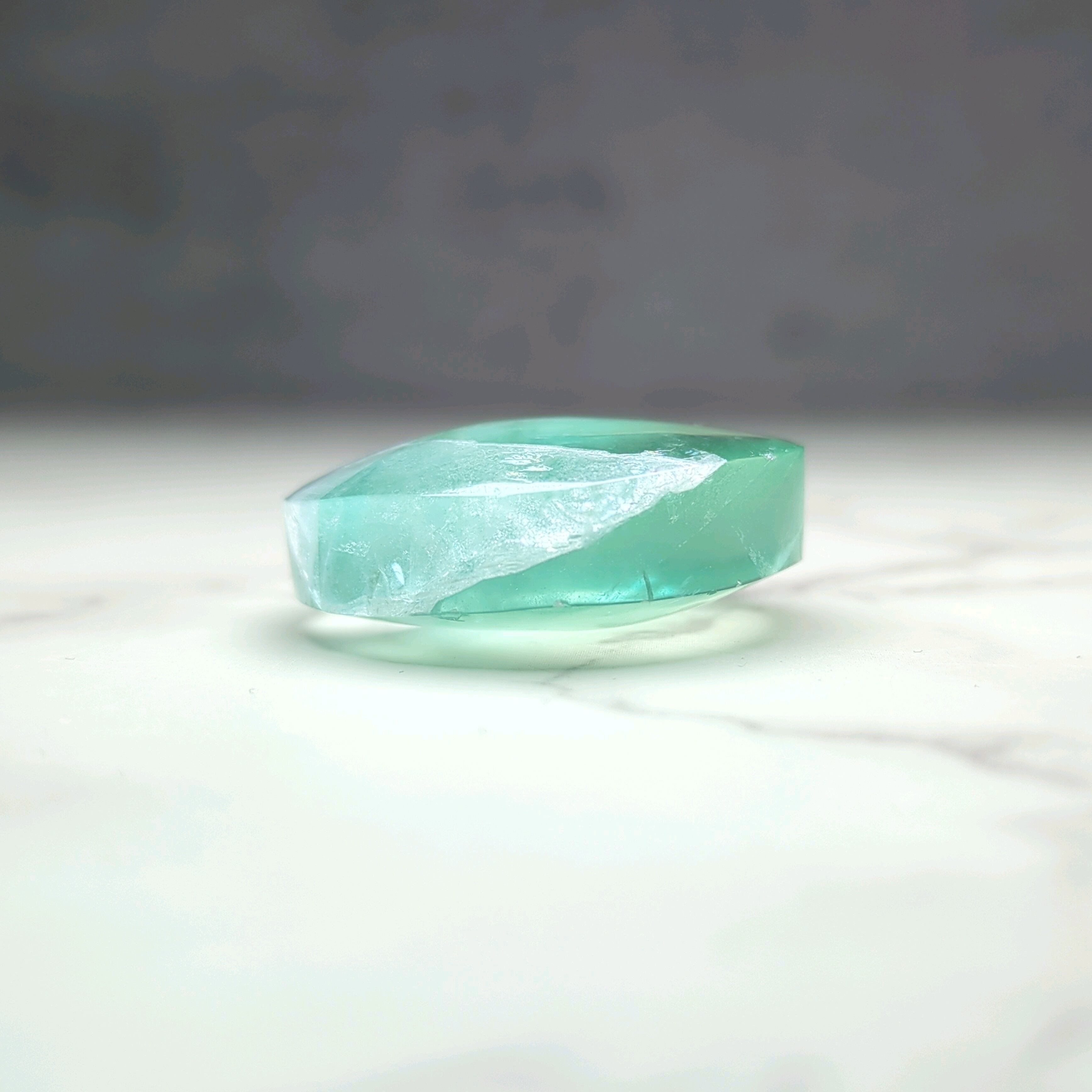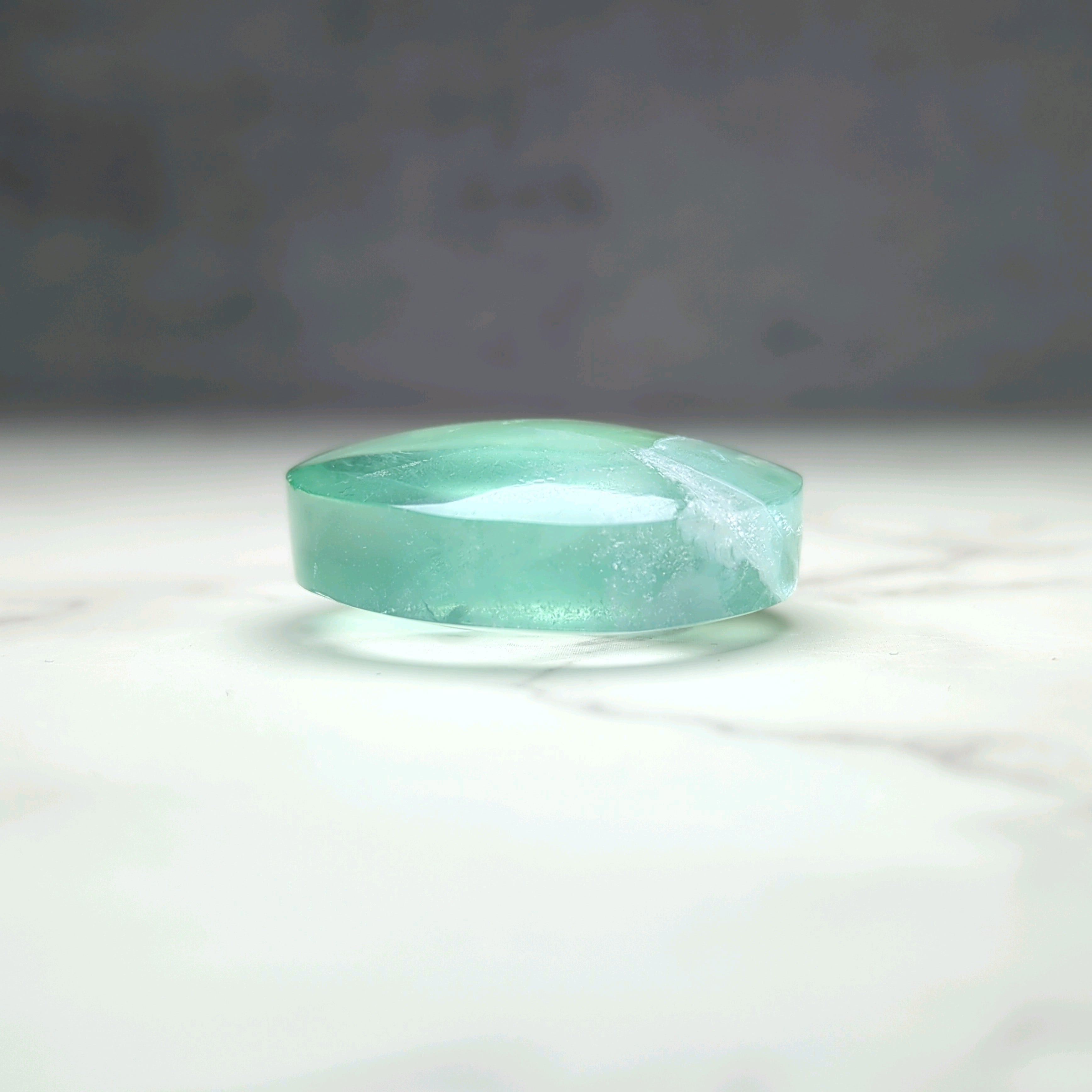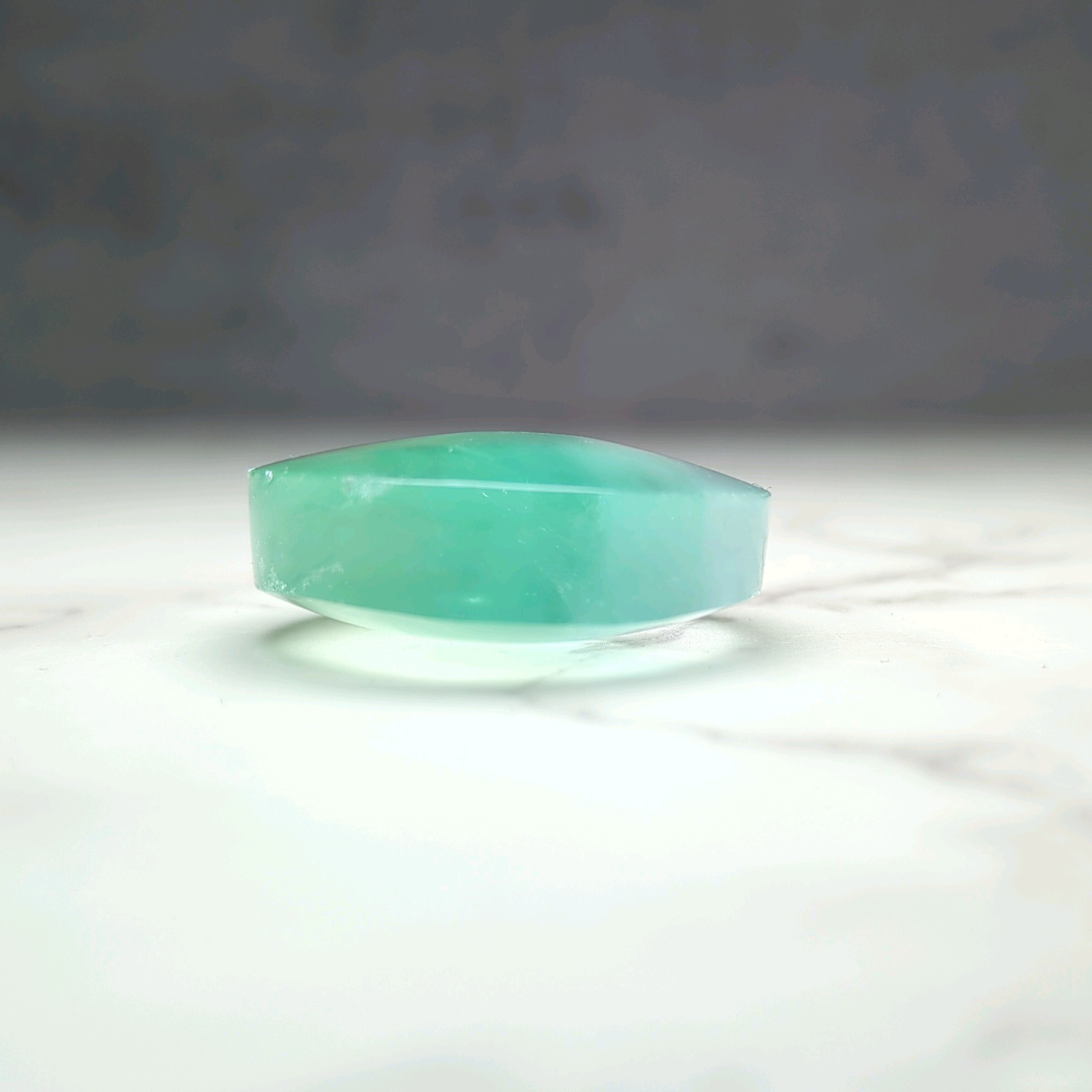 透明度が高いブルーグリーンと透明がぷるぷるとしたドロップのようなピース。