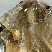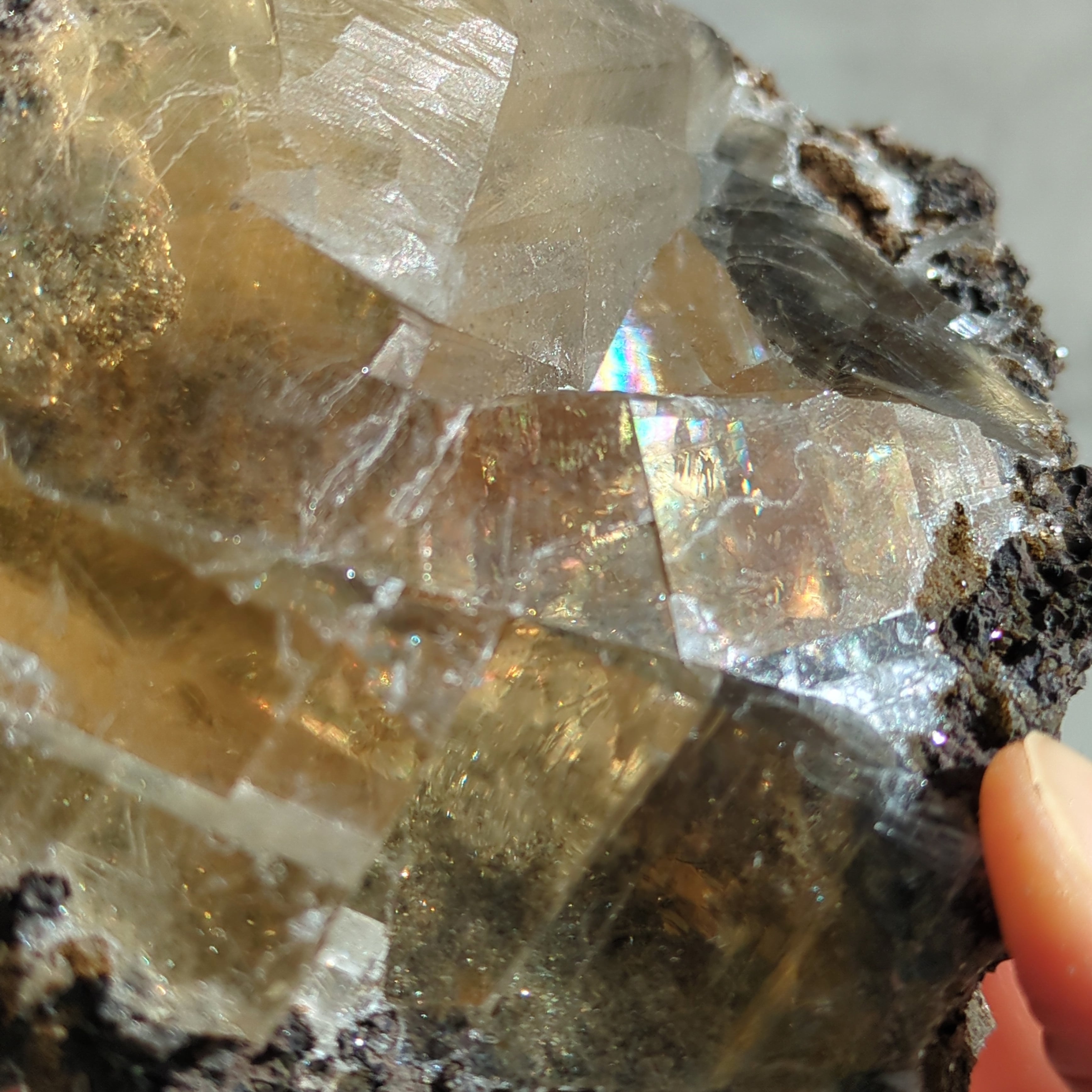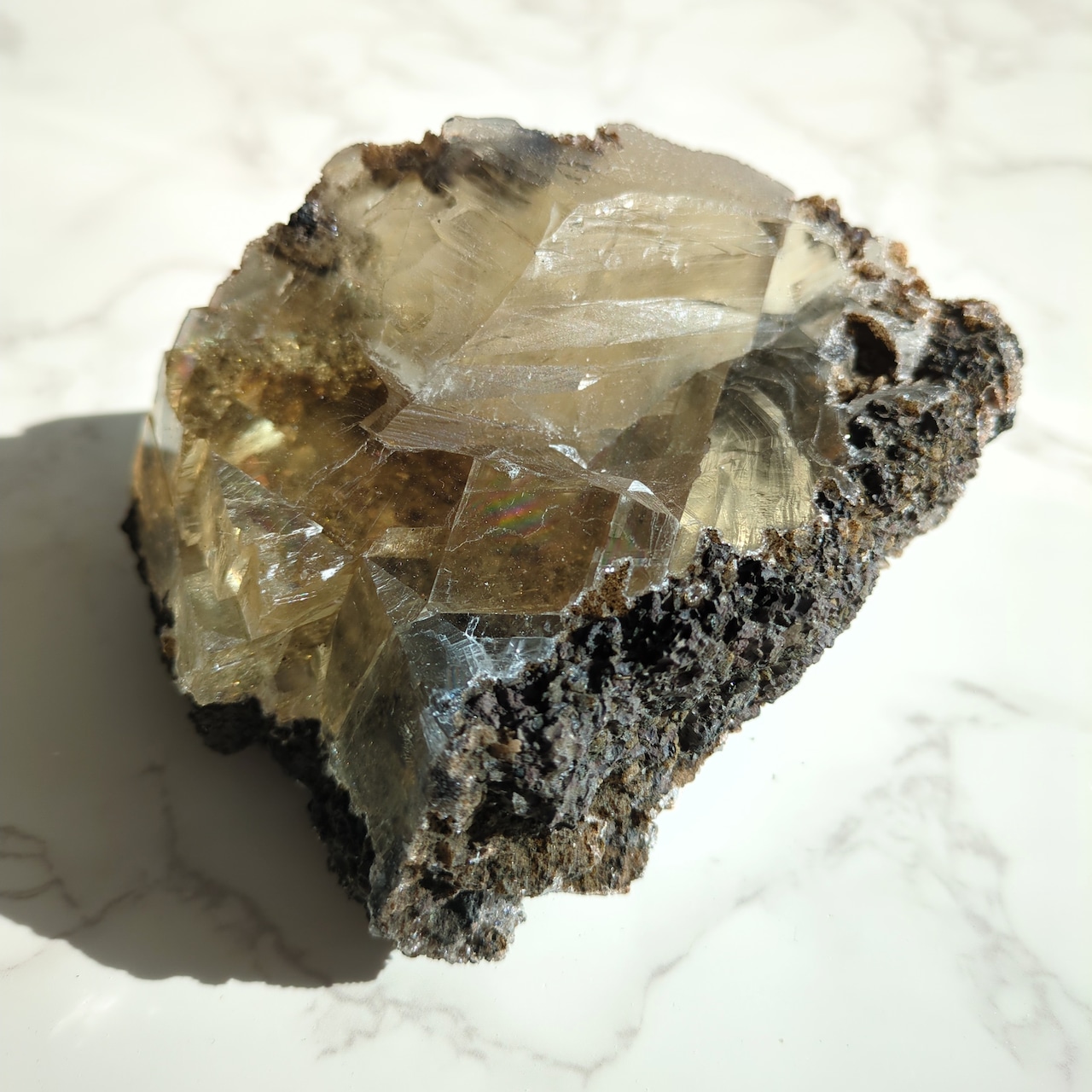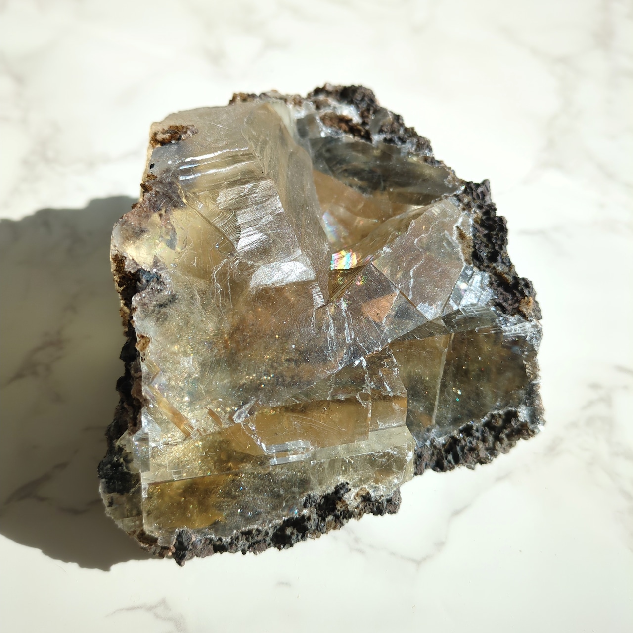 母岩に包まれた、力強く虹の入るイエローのカルサイト。