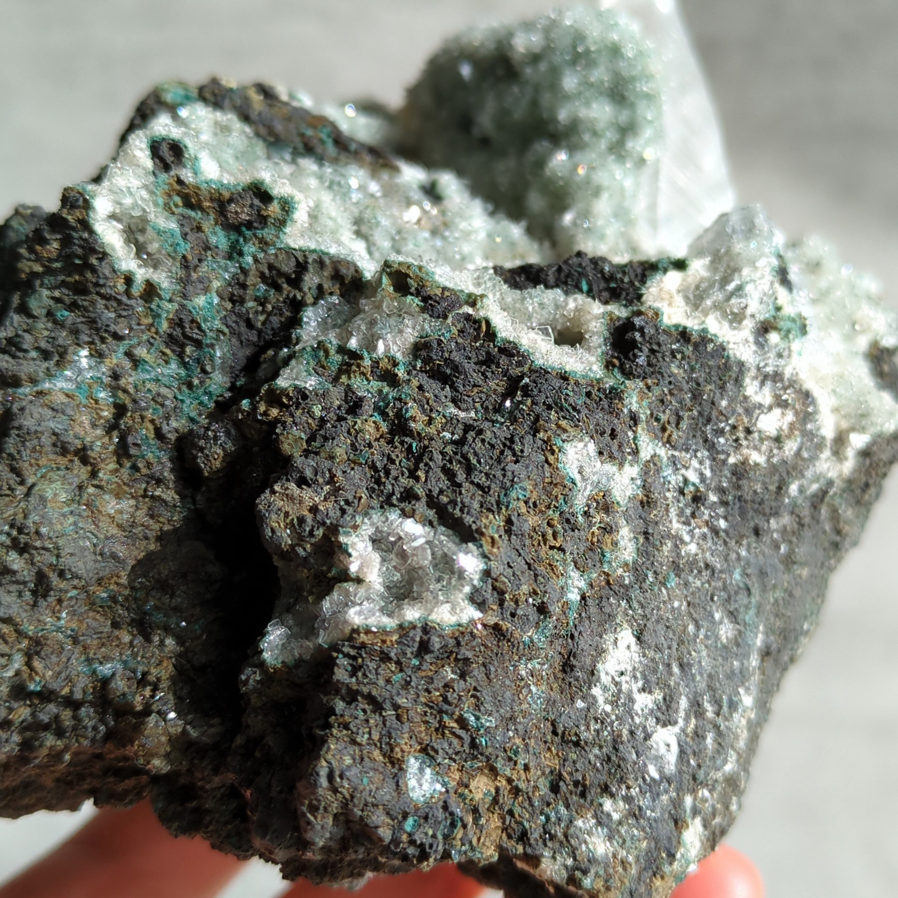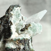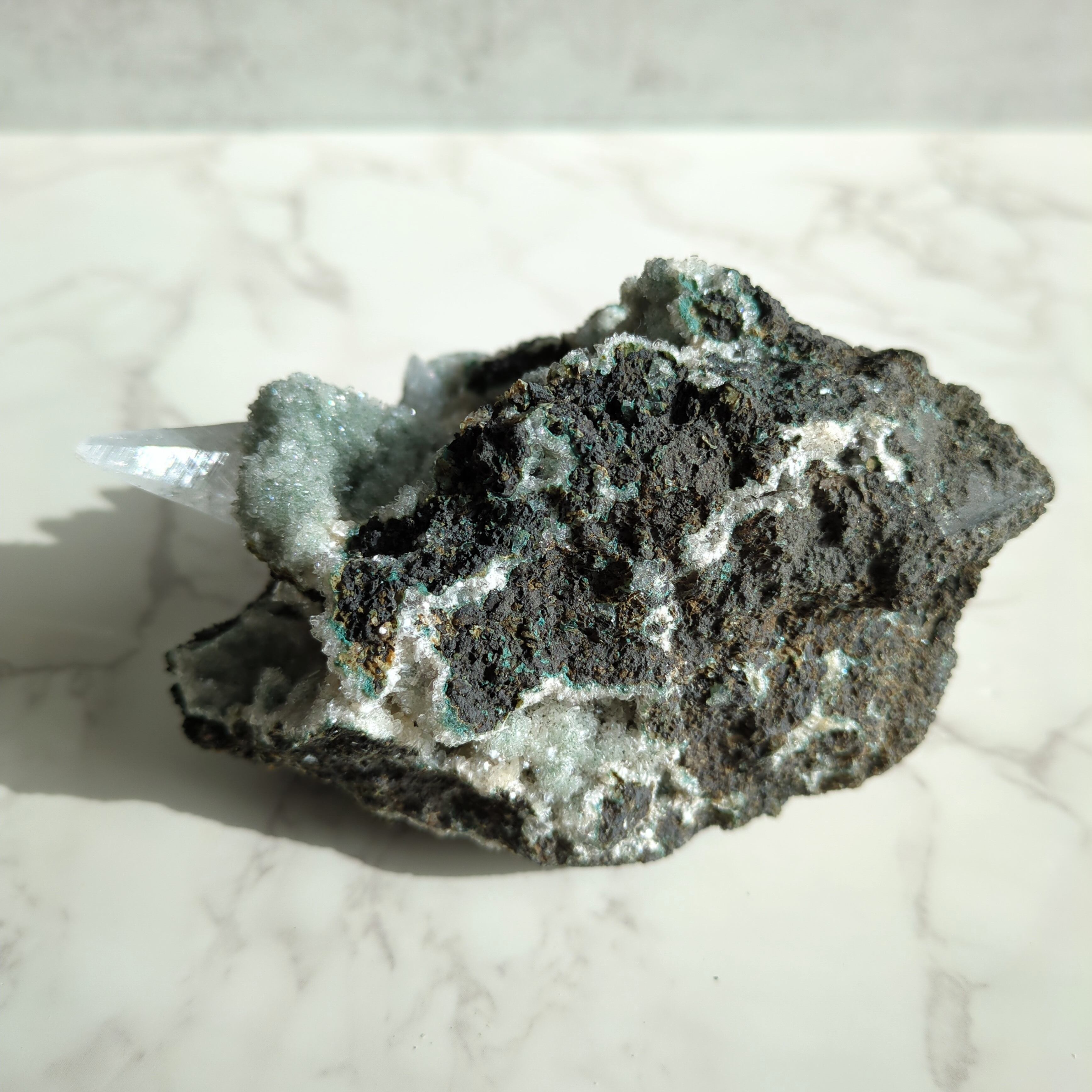 ミントグリーンの細かなカルセドニーが眩く煌めく中に、しゅっと生えた一本のカルサイトの結晶。