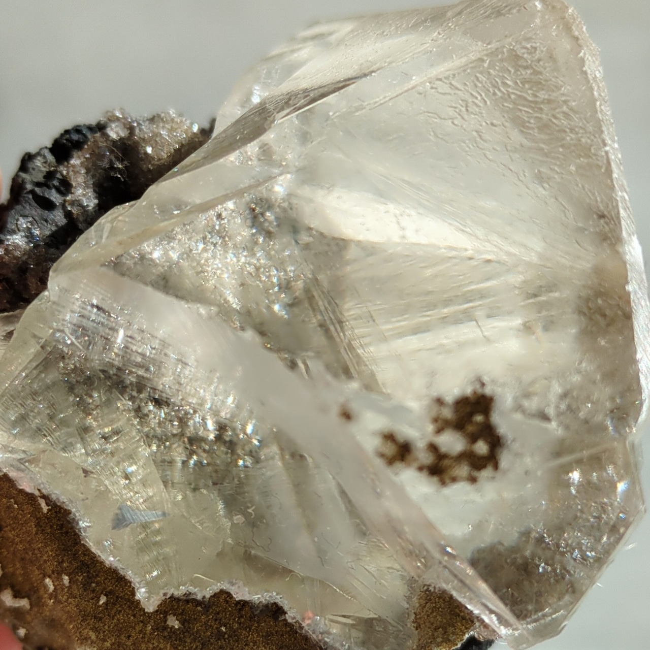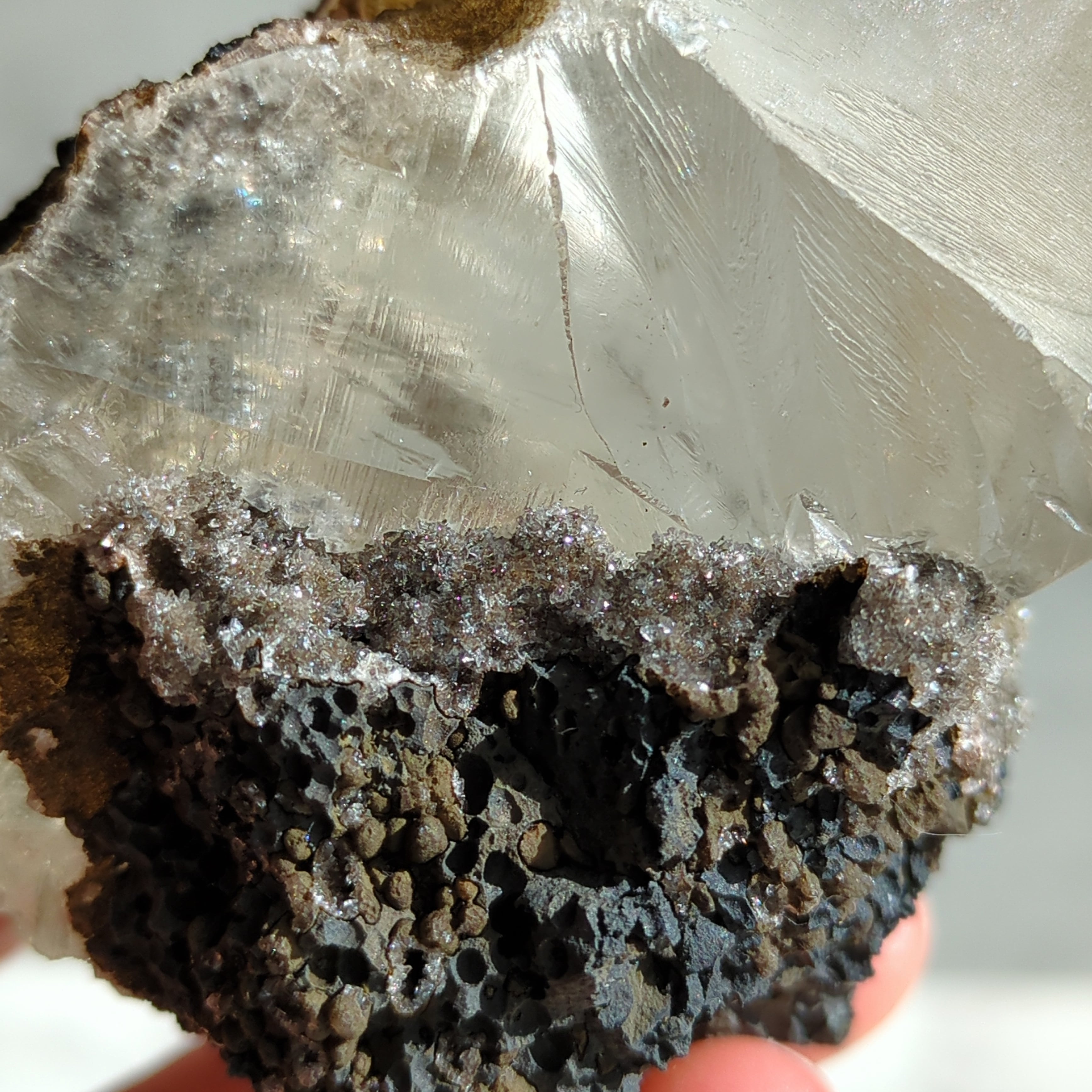 透明感のあるカルサイトの中を除くと、カルセドニーが無数に煌めく姿が見られます。