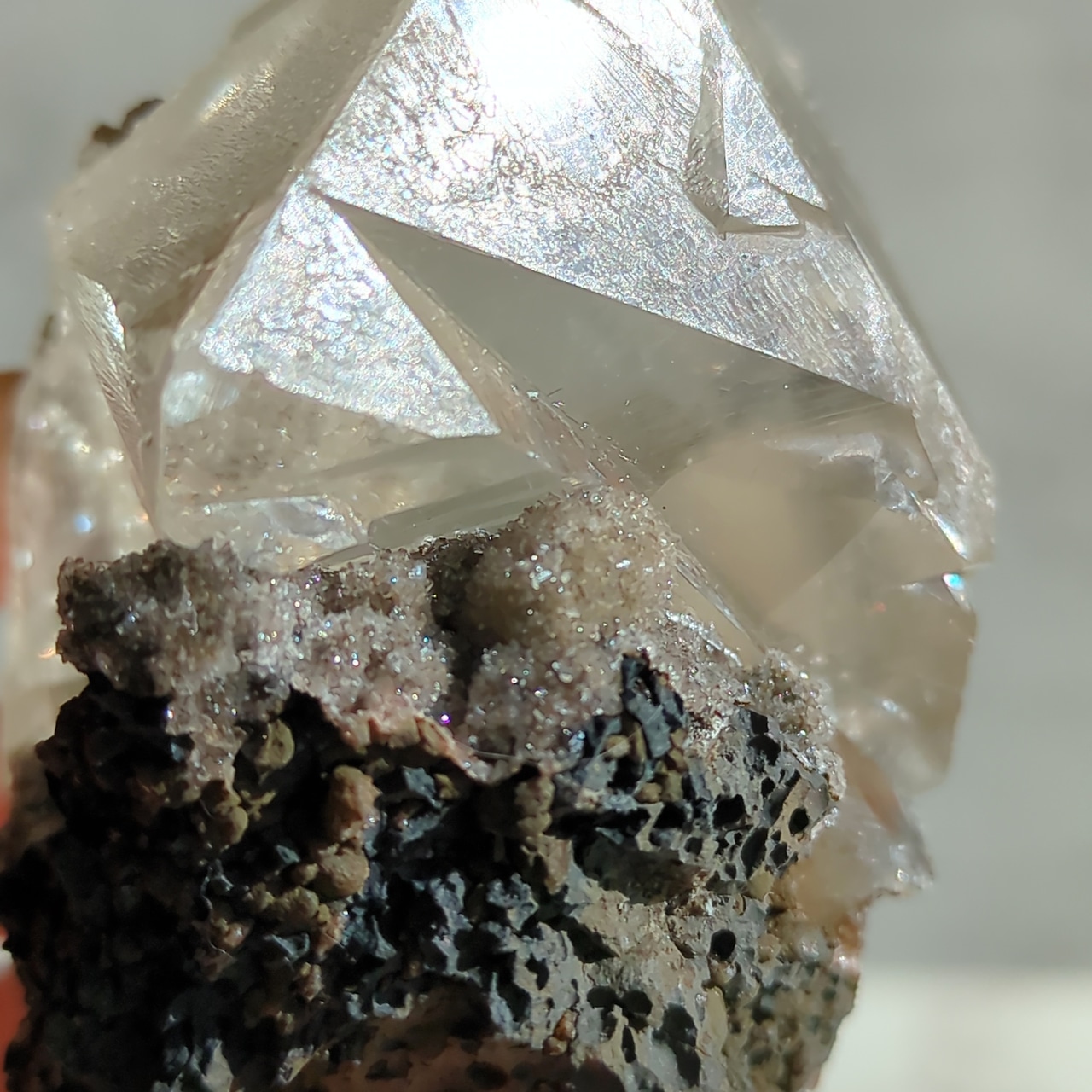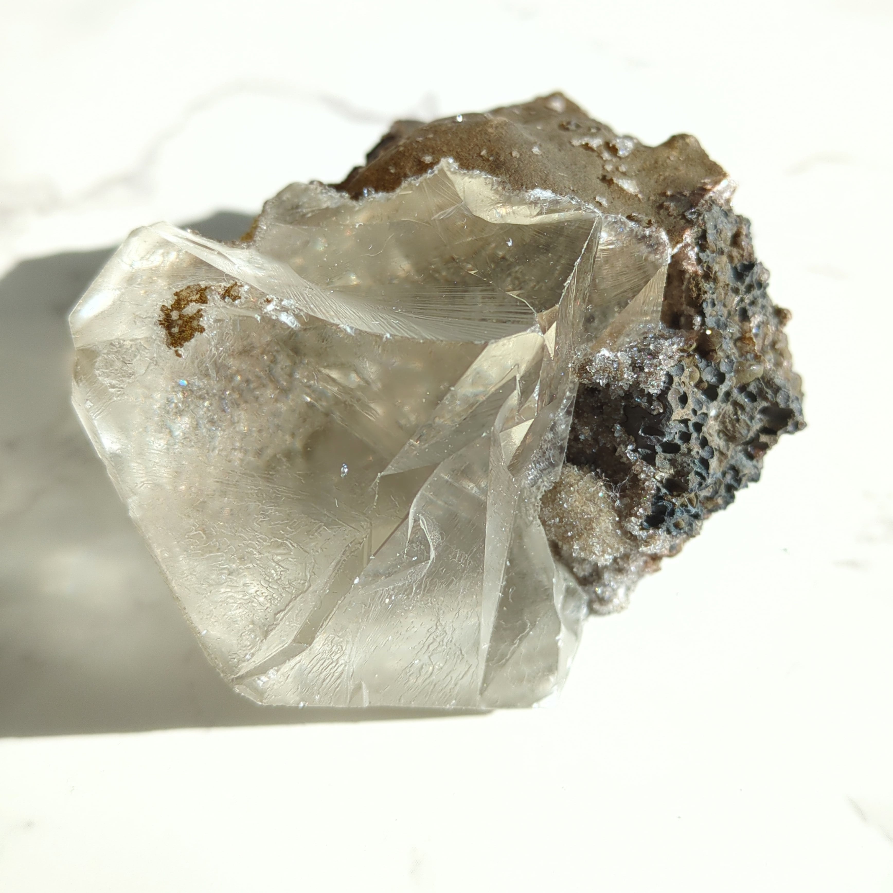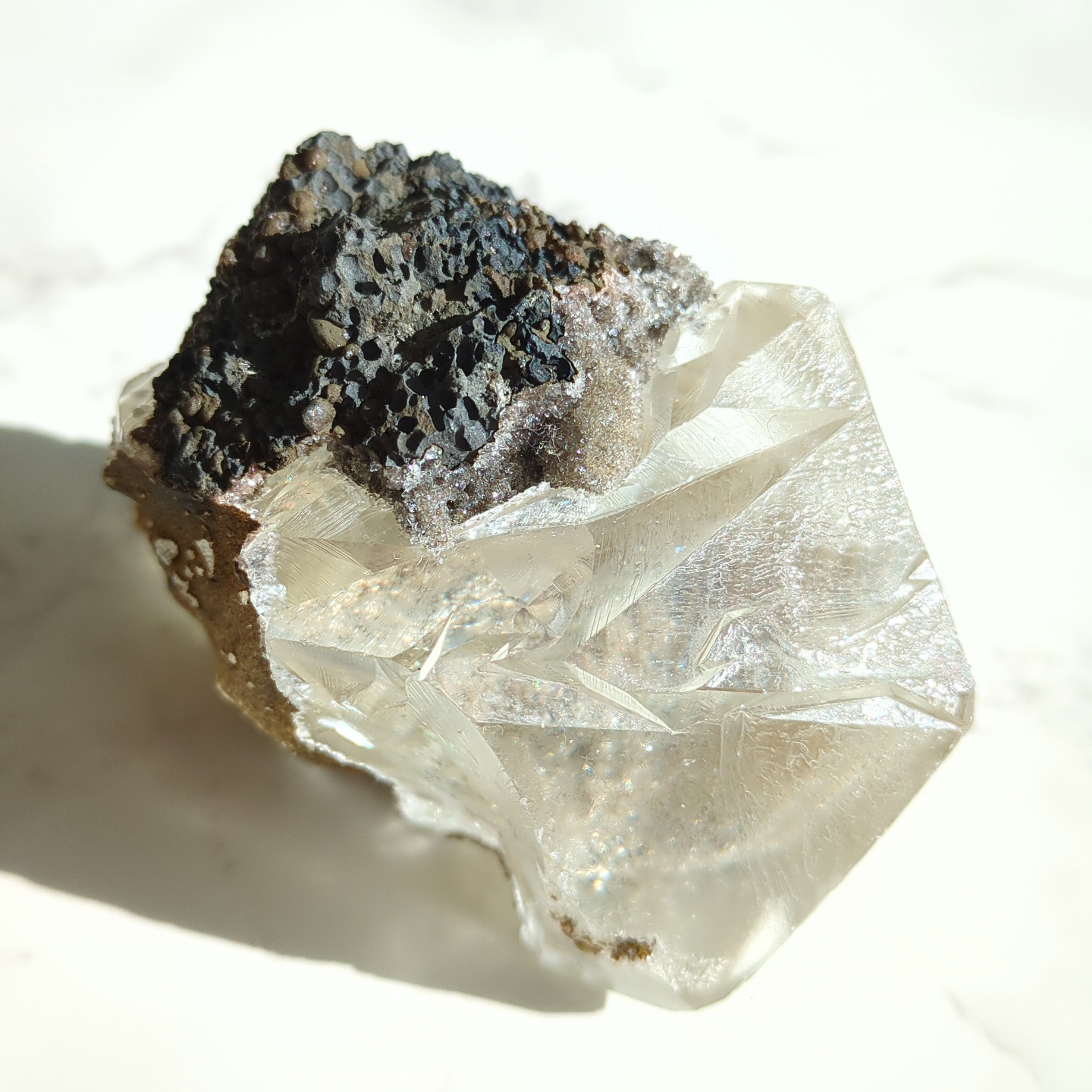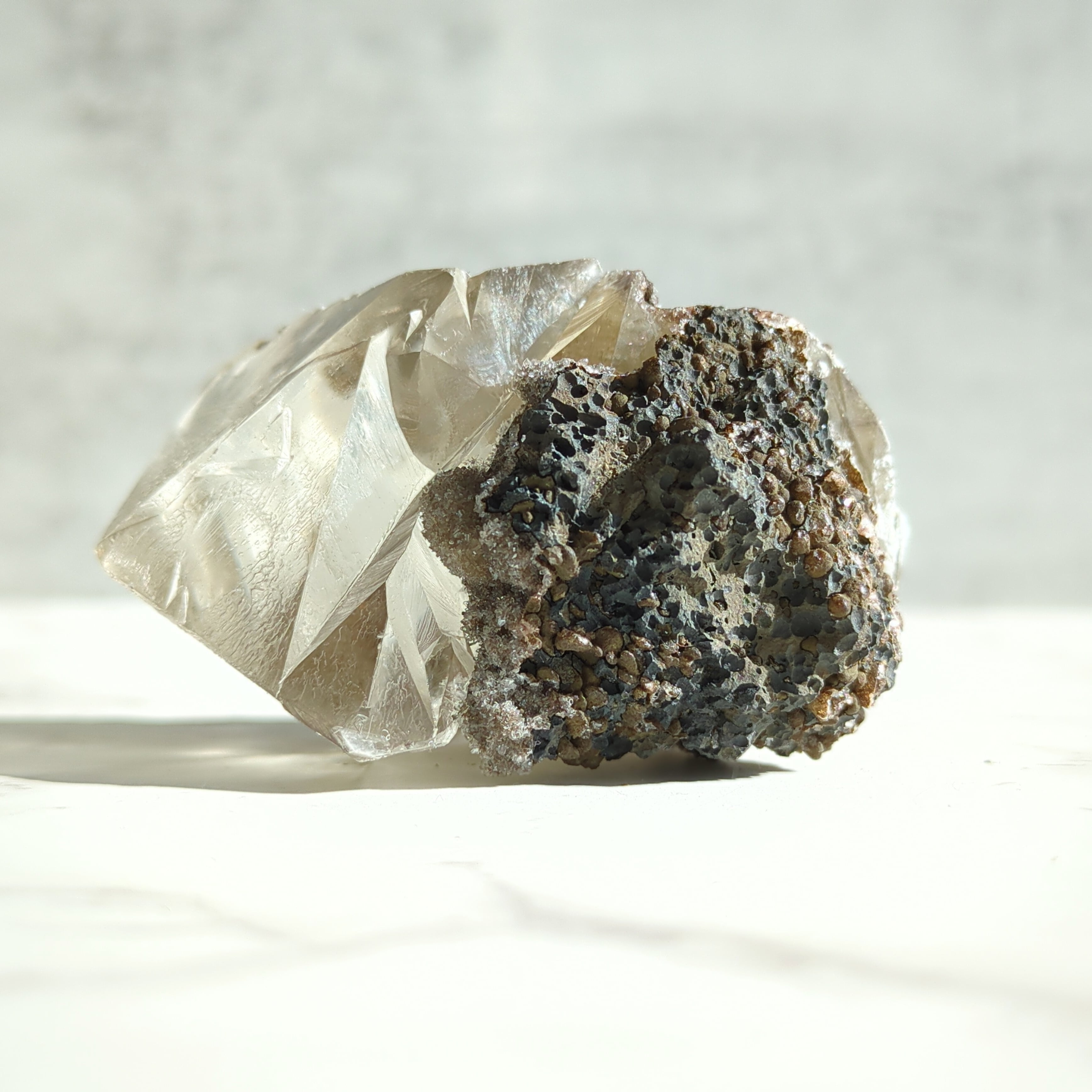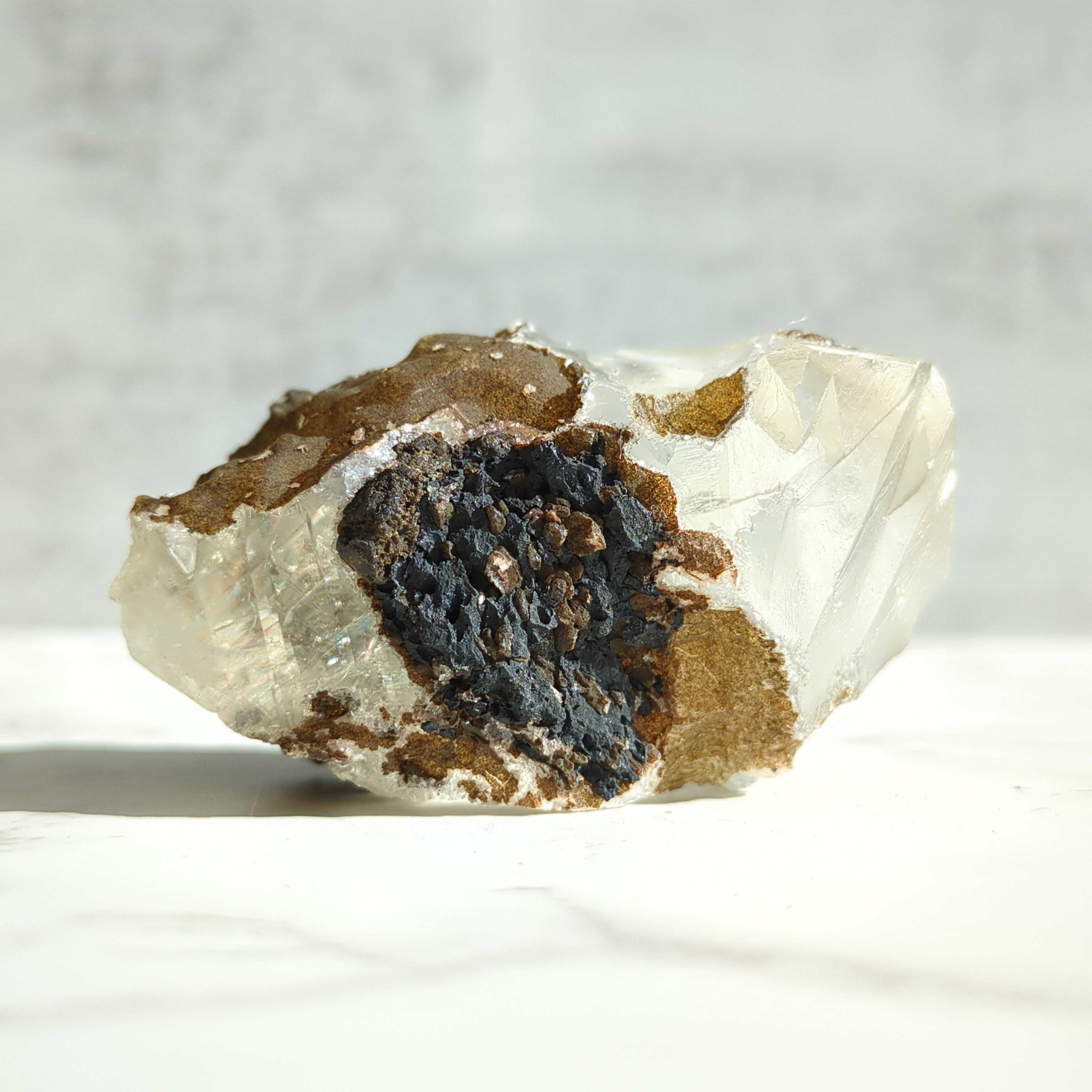 カルサイトの外にもカルセドニーが共生し、光を浴びてキラキラと美しいです。